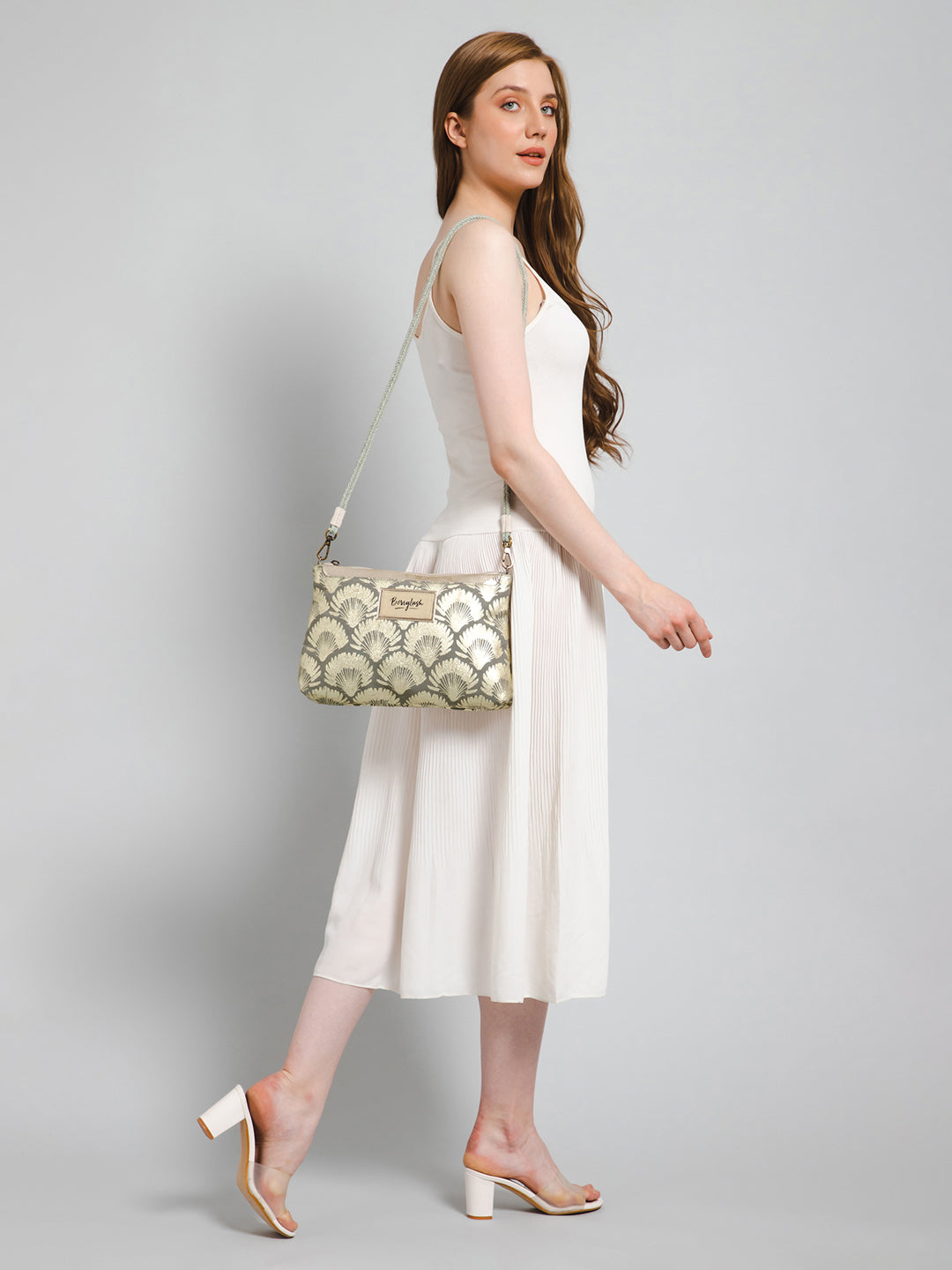 Lead the casual style with dynamic and limitless options just like this beautiful Grey Floral Printed Small Clutch/Sling Bag from the exclusive accessories collection of Berrylush. Adorned with a dazzling combination of grey shade and shiny silver floral print that gives this bag a boho-chic and captivating appearance. Comes with a detachable sling strap that makes this bag easy to carry and commute while travelling around with a multi-styling option such as a clutch or sling bag. Also, the golden Berrylush logo at the front add-on classy decorative detail and a brand mark to this bag for a luxurious feel. Look glamorous while stepping out to attend casual events by pairing your athleisure outfits with this bag.
