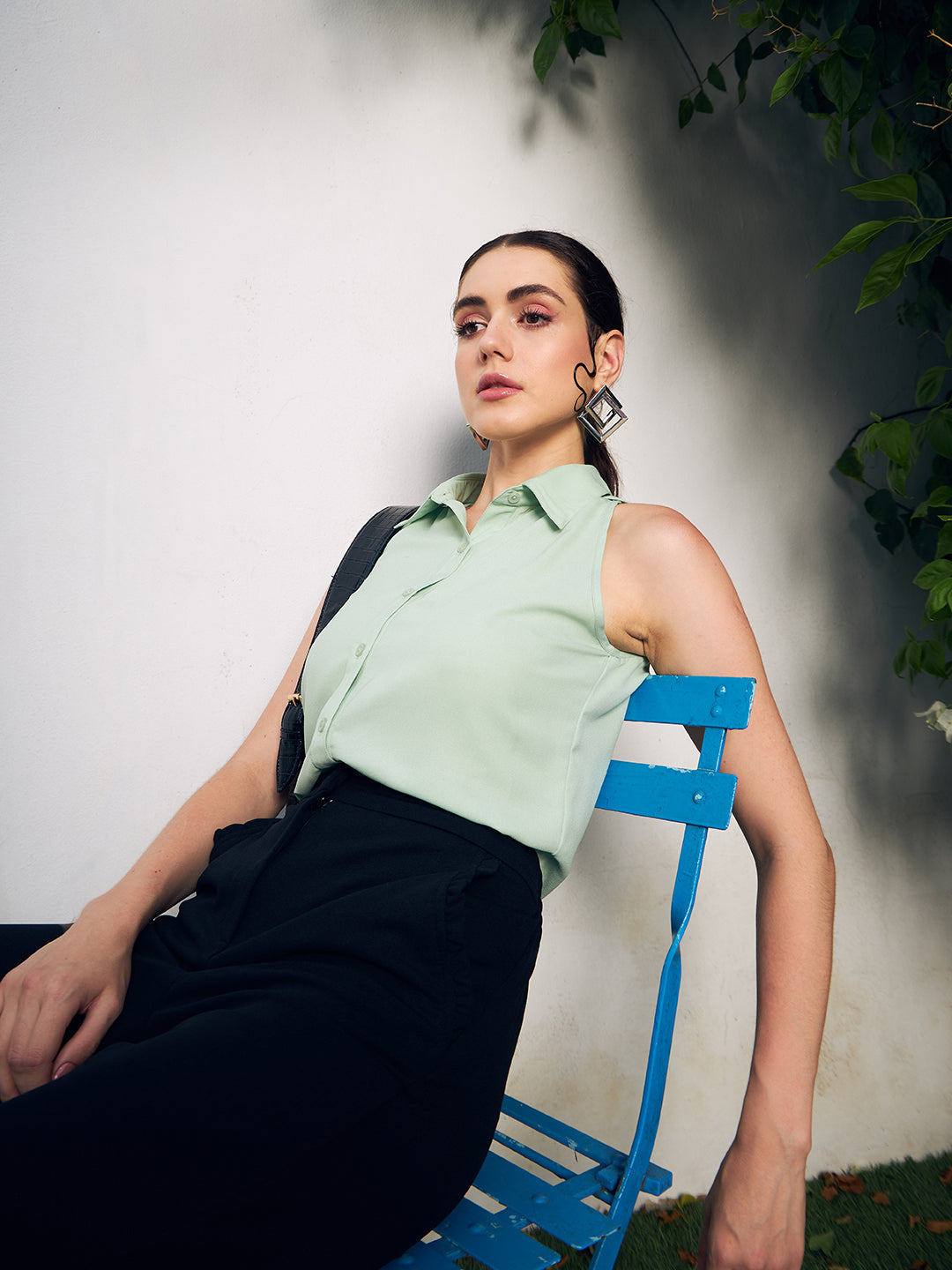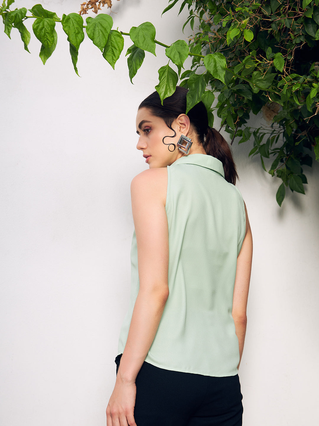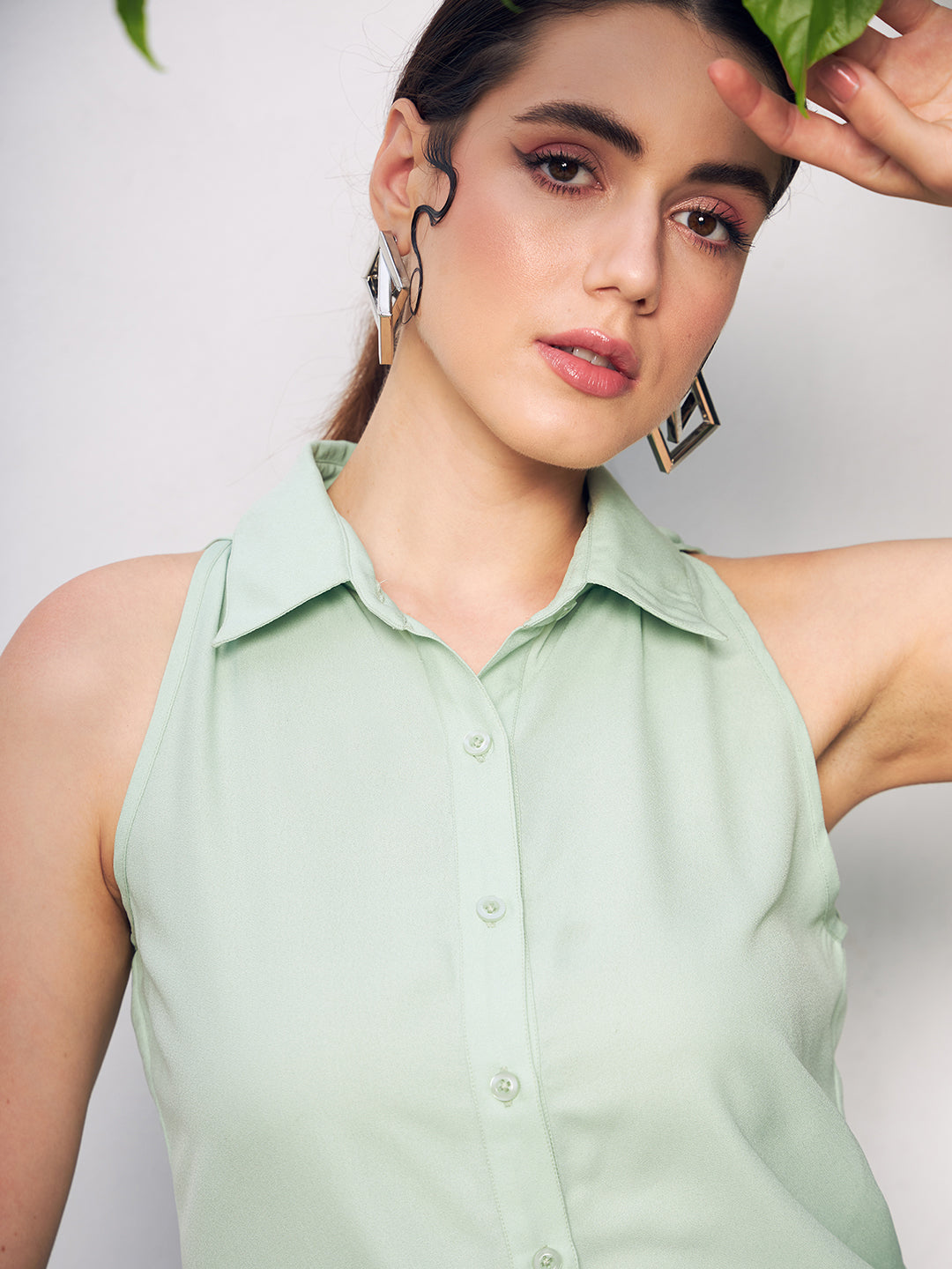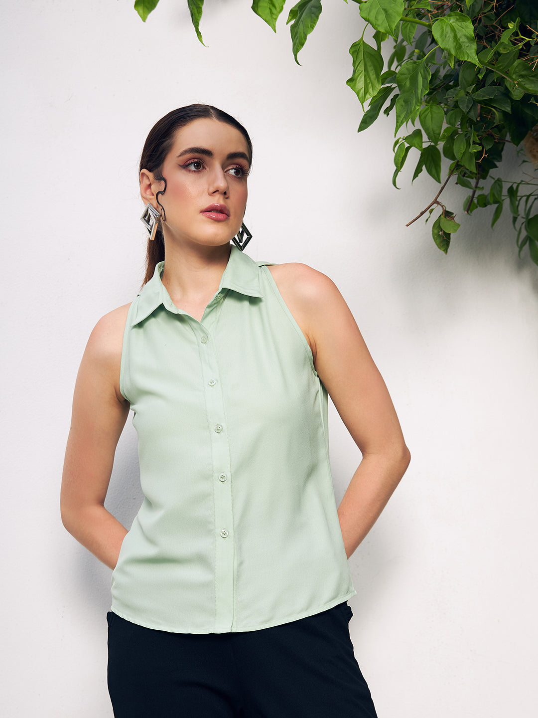 Berrylush BIZwear Women Solid Green Spread Collar Neck Sleeveless Front Button Straight Hem Regular Shirt