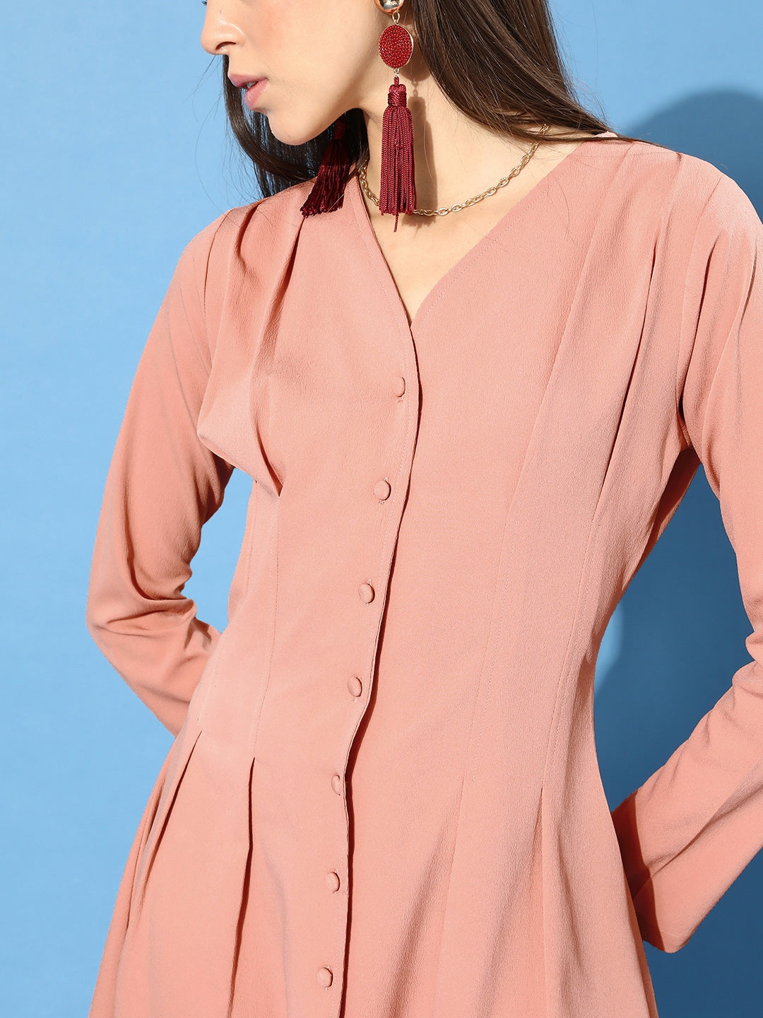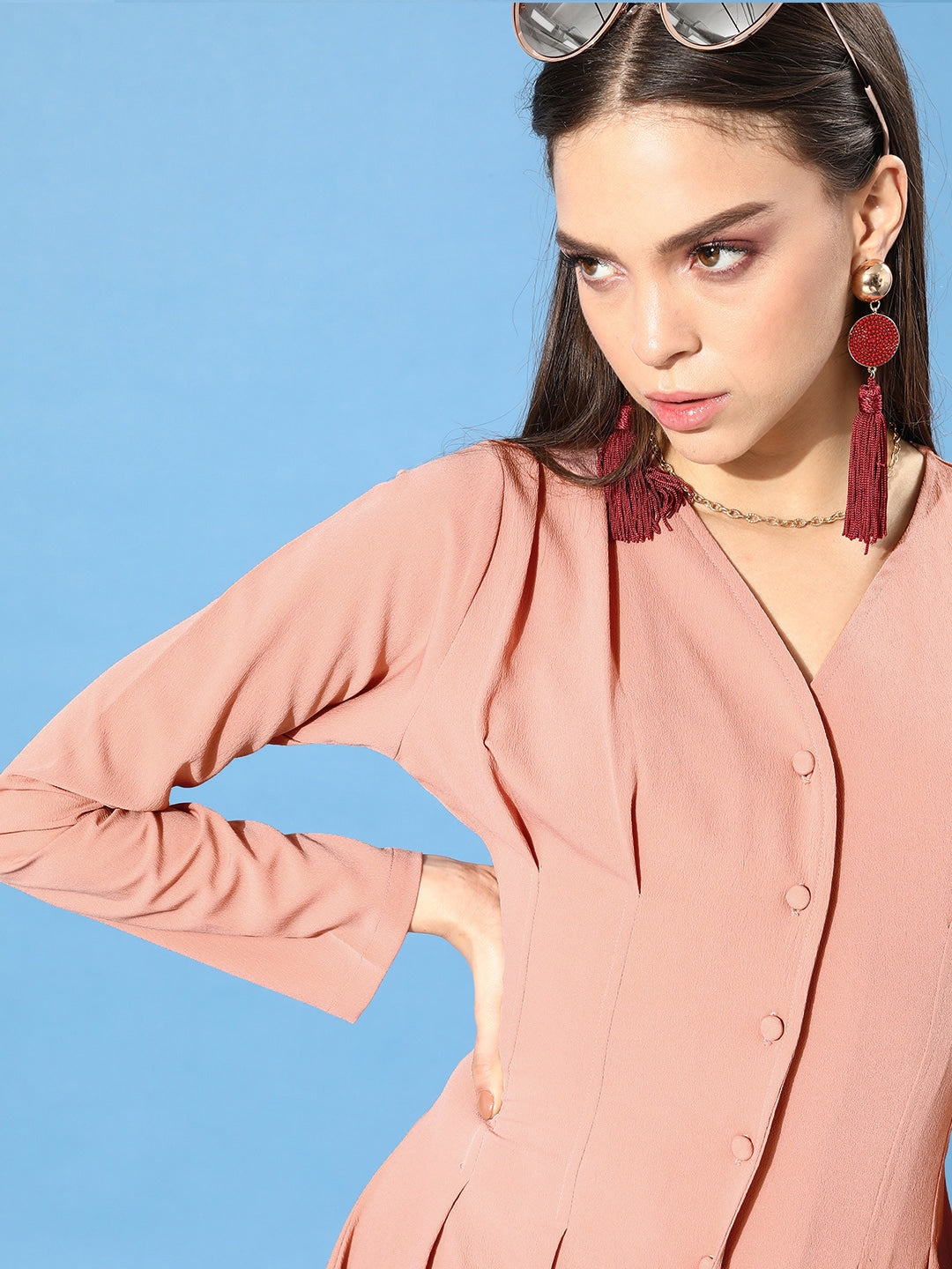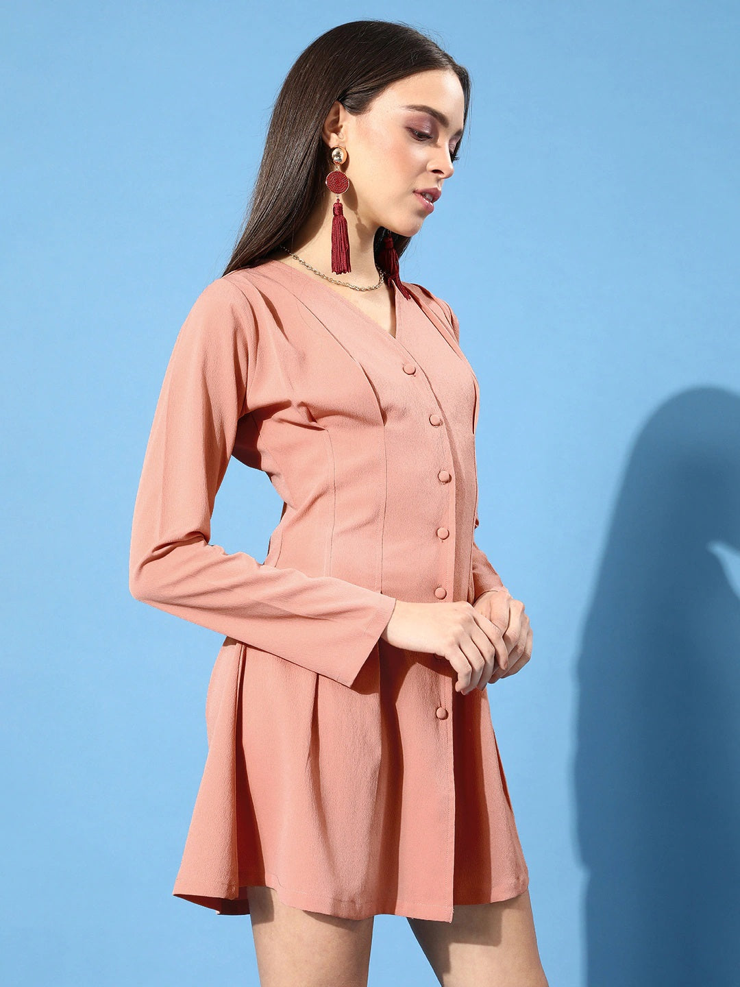 Berrylush Women Solid Peach Front Button Crepe Shirt Mini Dress