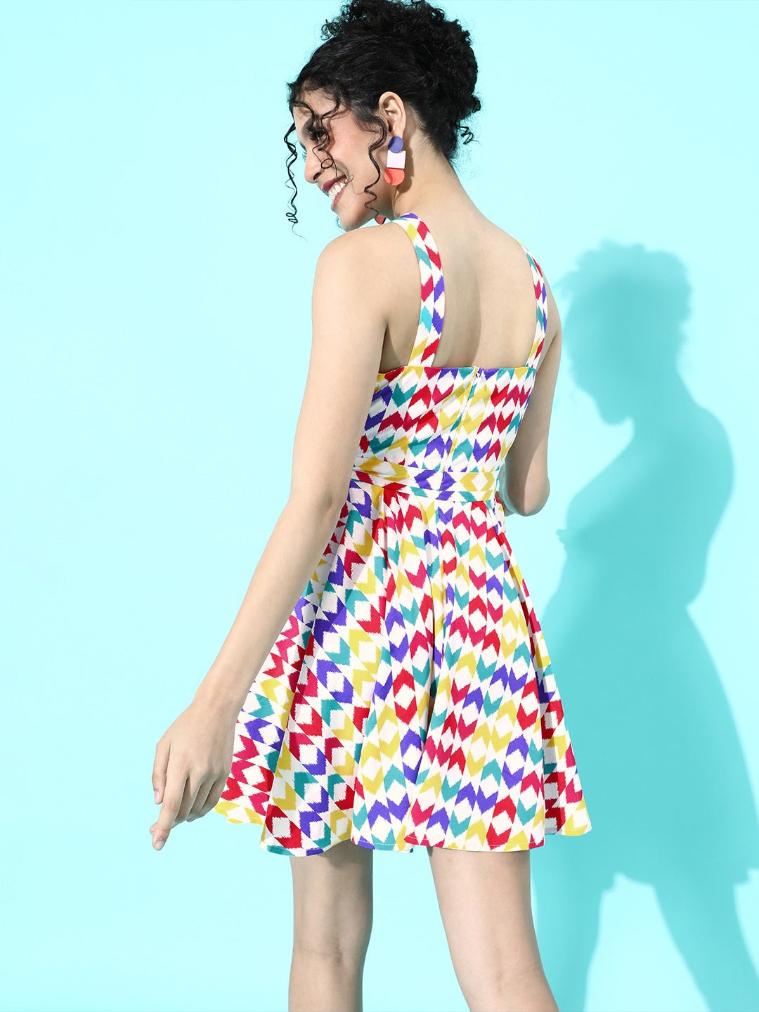 Multicolour is the new basic trend of the summer season, thus add some funky and playful vibe to your casual wear with this amazing White Halter Neck Flared Fit & Flare Mini Dress from the geometric print collection of Berrylush. You are sure to love this dress as the halter neck gets your neckline a sophisticated and attractive view. The most admirable element of this dress is its geometric multicolour print on the white shade which takes your causal personal style to a new height as it brings out monochromatic essence from your look. The crepe polyester fabric keeps the dress lightweight and airy making it a suitable option for long hot days. Mini length with flared hemline assembles an exotic appeal with fleek movements. Wear this dazzling mini dress with block heels and hoop earrings to get a stunning appearance for your lovely date or weekend picnic plans.