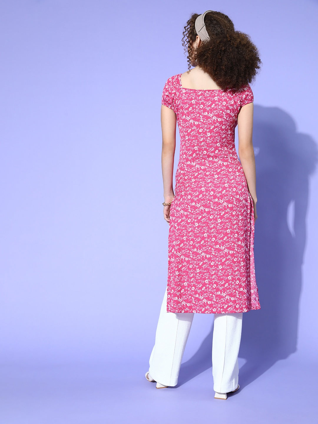Refresh your ethnic contingent with a dash of modern and feminine style by wearing this elegant Pink & White Floral Printed Tie-Up Neck Side Slited Calf Length Kurta from Berrylush. Designed with a tie-up neck that lends an ornamental sheen to this kurta along with a decorative outline to your neckline area without exposing much of your skin. Also, the calf length of the kurta gracefully complements the curvy silhouette and gives attractive coverage to your lower body portion. Run an errand or have a fun time with family in a gorgeous appearance by wearing this floral printed kurta with a white parallel palazzo, cute earrings, and a stylish handbag.