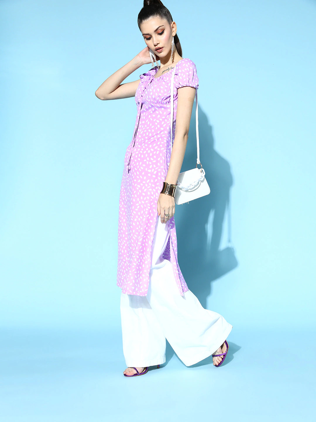 Berrylush Women Lavender & White Abstract Printed Tie-Up Neck Side Slited Calf Length Kurta