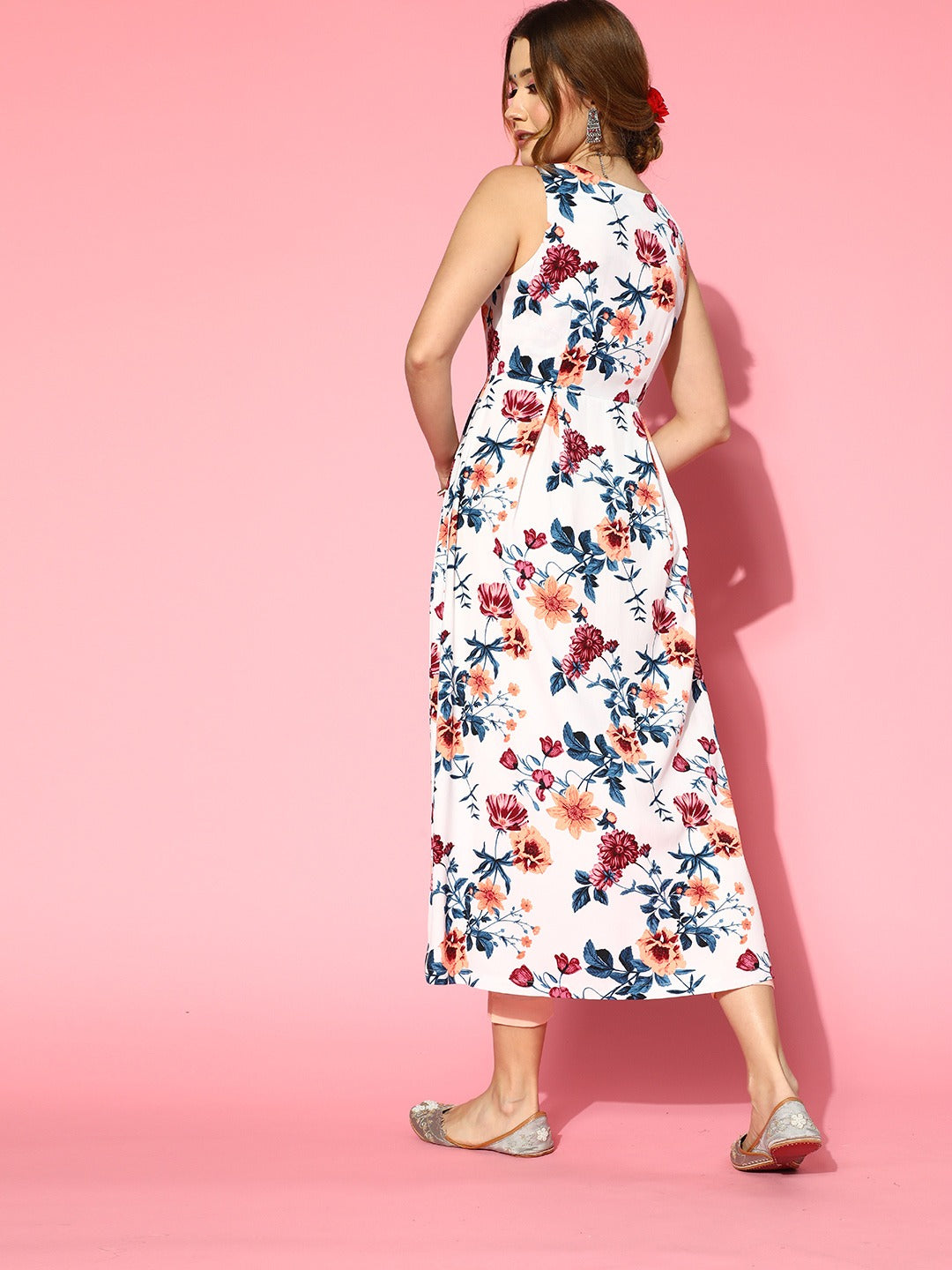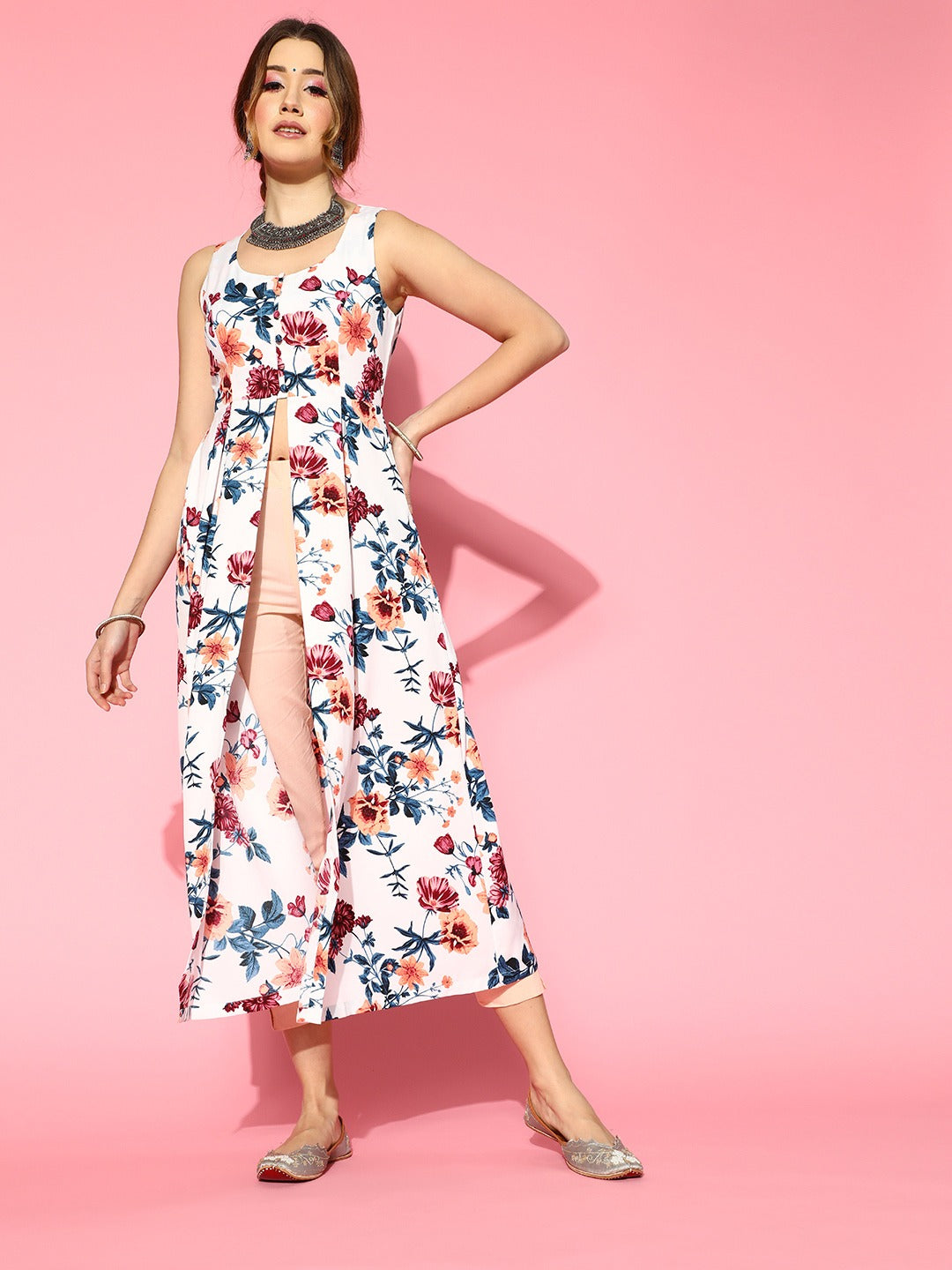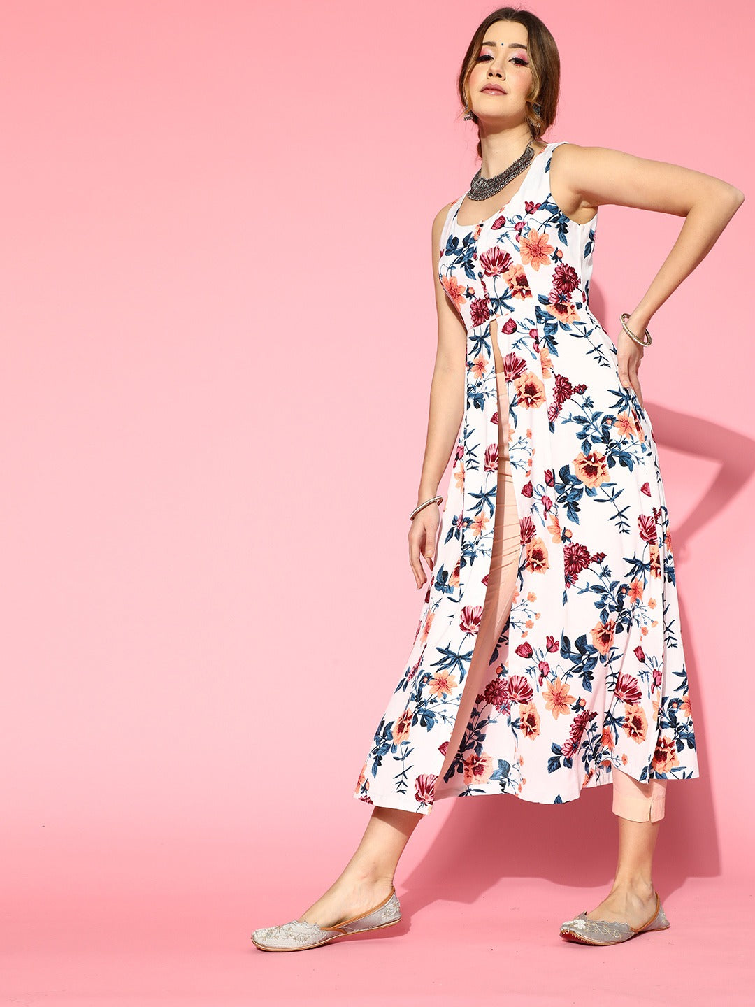 Berrylush Women White Floral Printed Round Neck Front Slit Flared A-Line Calf Length Kurta