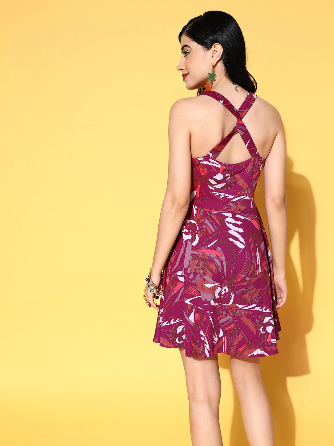 Berrylush Women Purple & White Abstract Printed Round Neck Criss-Cross Back Flared A-Line Mini Swimming Dress