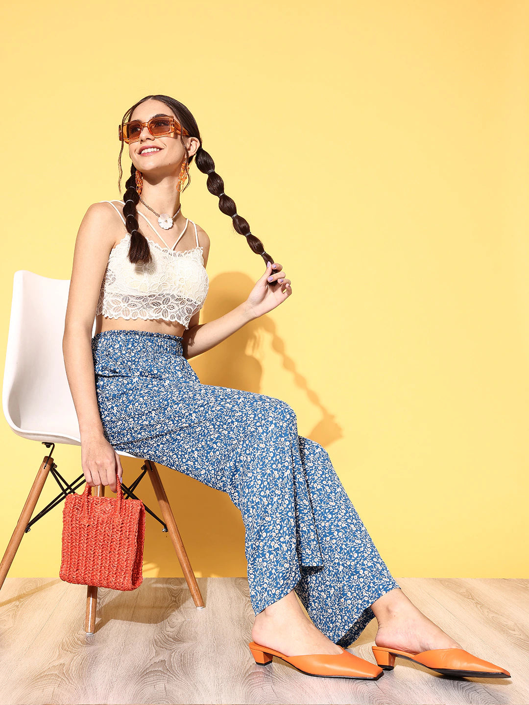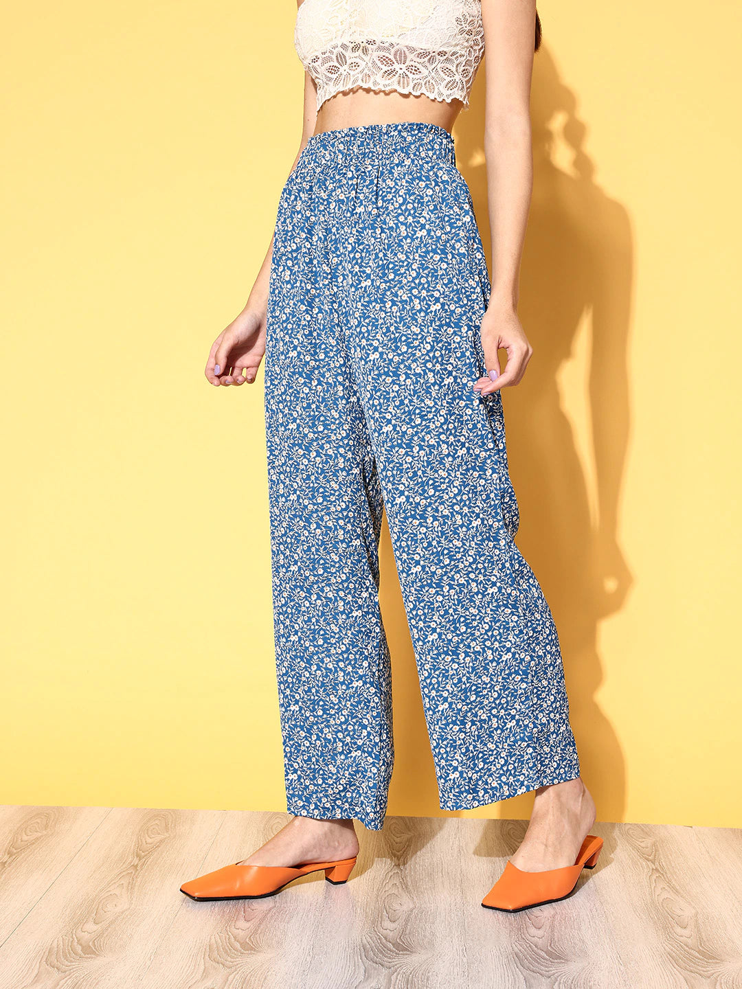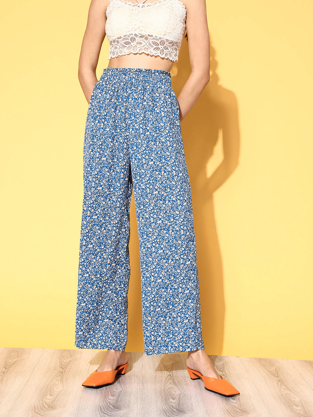 Berrylush Women Blue & White Floral Printed Loose Fit High-Rise Elastic Waist Pleated Trousers
