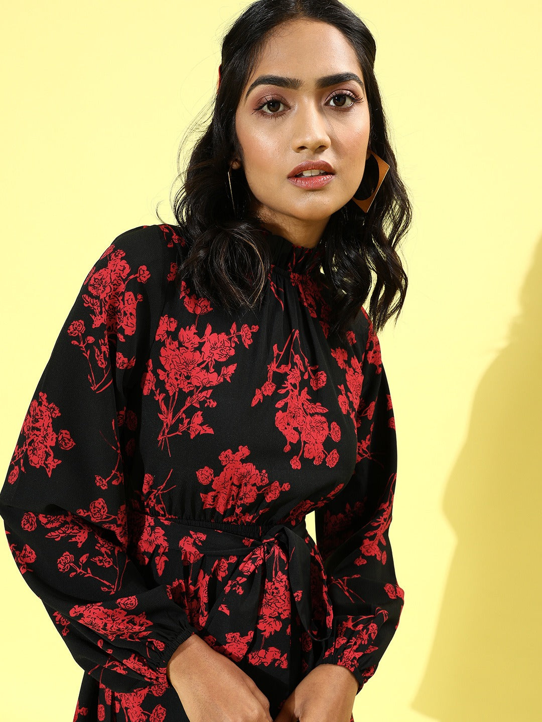 Berrylush Women Black & Red Floral Printed Halter Neck Waist Tie-Up Flounce Mini Dress