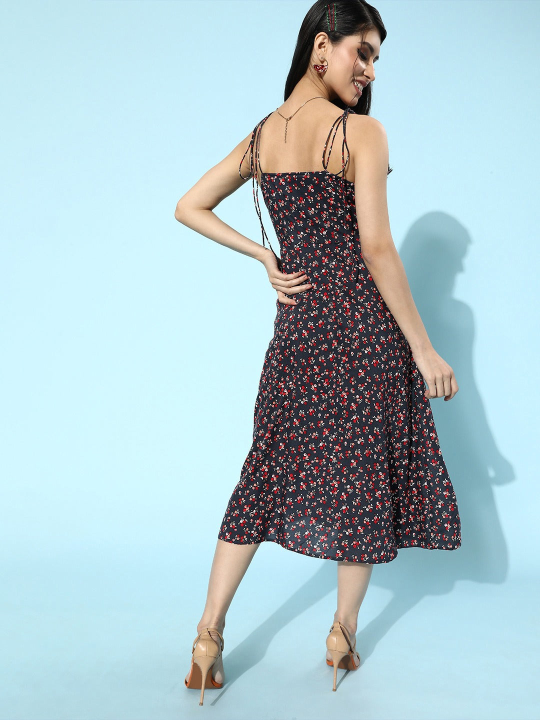 Berrylush Women Navy Blue Floral Printed Sweetheart Neck A-Line Midi Dress