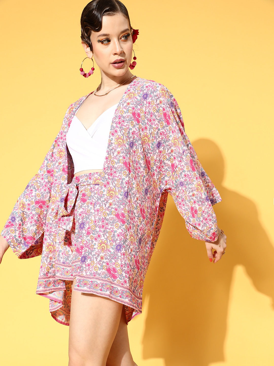 Berrylush Women Pink & White Floral Printed Open-Front Straight Hem Regular Shrug
