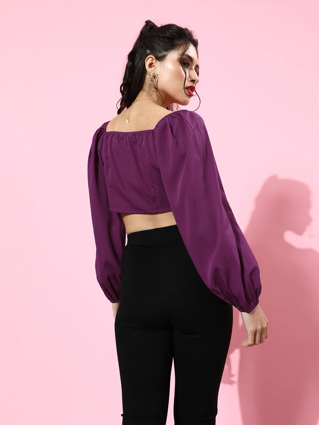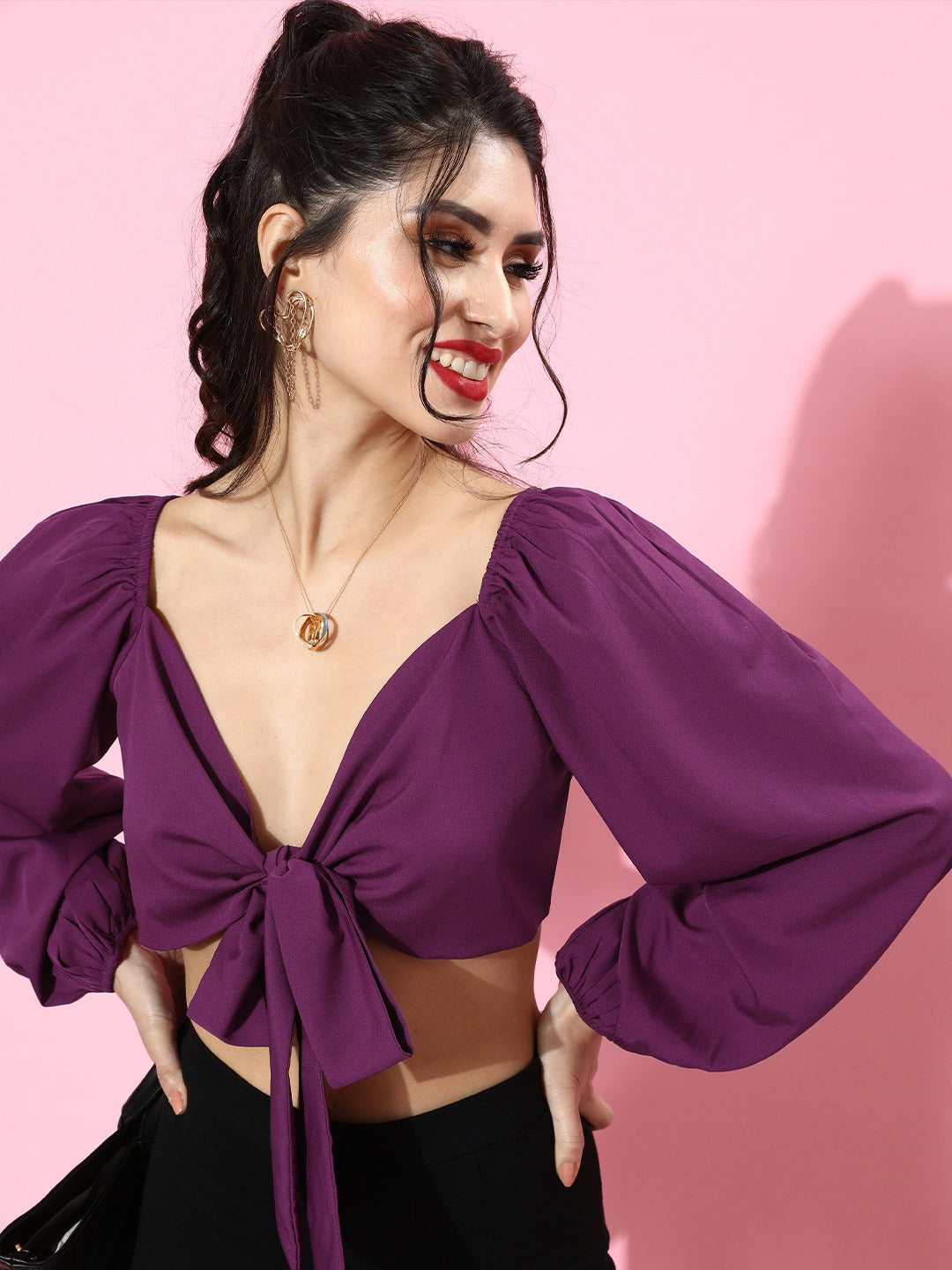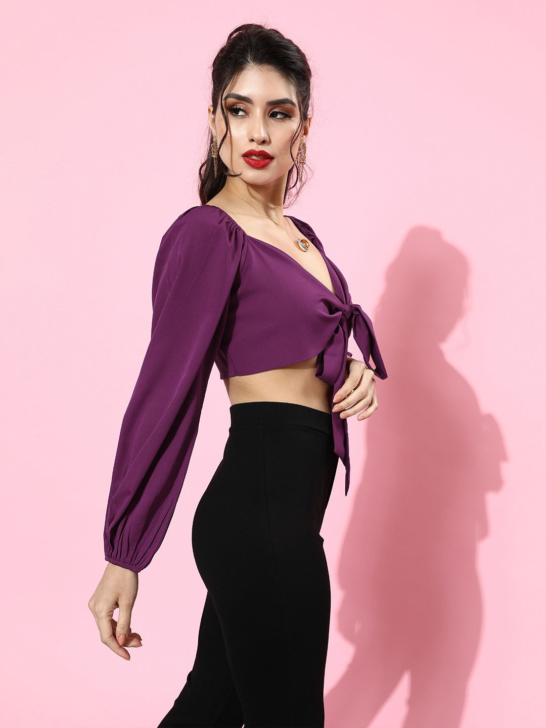 Look stunning on party night this season with this charming Solid Purple V-Neck Front Tie-Up Cropped Top from Berrylush. This top gives you a flaunting and captivating look with its crop length and tie-up knot closure attributes which garbs all the party attraction towards your seductive and unique styling. Crafted from crepe polyester fabric to give you a crispy look with the stain-resistance property. The long bishop sleeves of the top give a luxurious finish to your arms while the waist tie-up styling ensures a proper fit. V-neck design makes your neckline appeal modish and classic. The blouson shape of the top enables you to get the basic main party trend effortlessly. The purple colour with solid pattern gets you a vintage vibe with a figure-flattering style and distinct look. You can complete your on-go party look by pairing this alluring top with black denim jeans and high heels to get a captivating look.