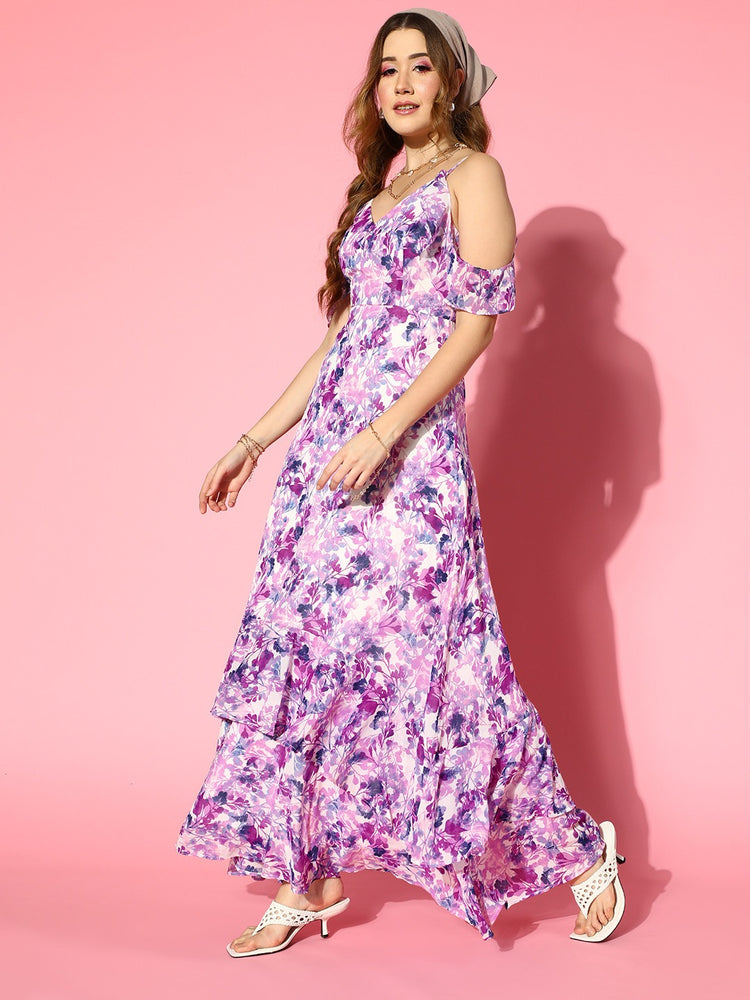 Get your style inspiration from the above images, as the image puts together a marvelous look created with a lovely White and Lavender Floral Printed V-neck cold-shoulder Style-Back Tiered Maxi Dress from Berrylush with a pair of matching heels. This dress is designed with layered surface styling that lends it a tiered style statement while the flared hemline makes it look more voluminous.