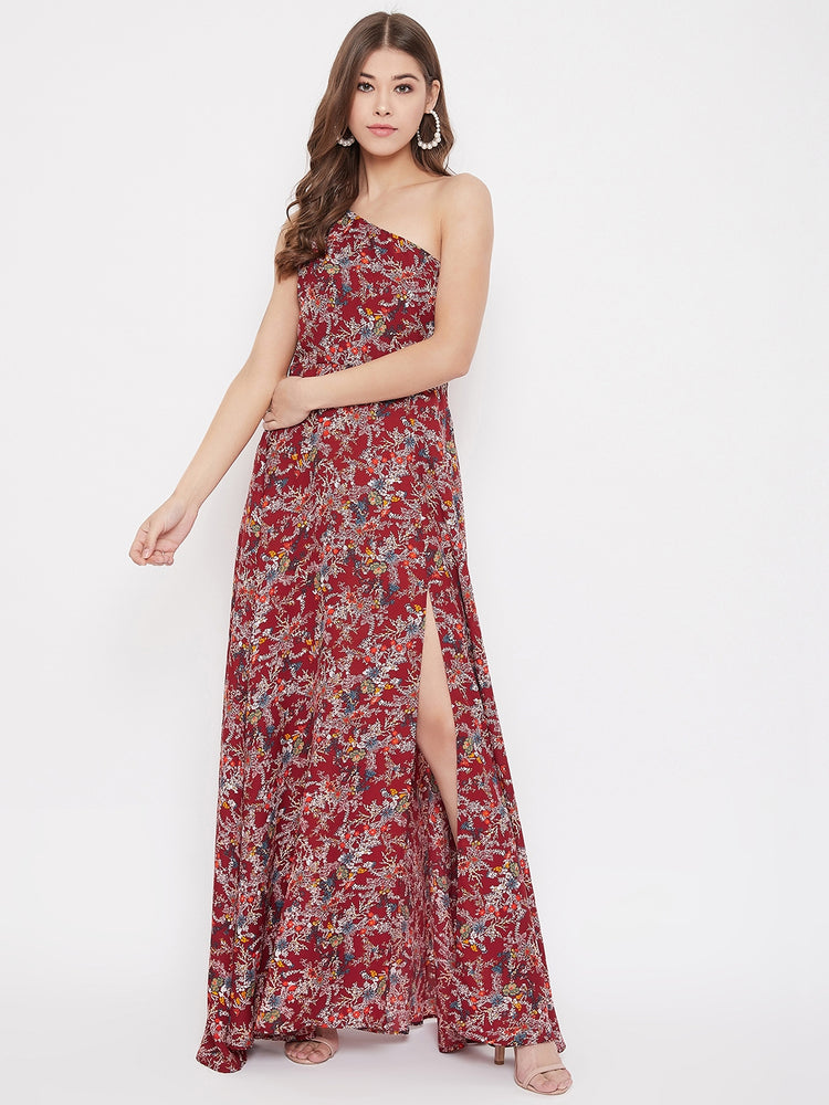 You can also get inspiration from the above images, as the beautiful Maroon Floral Printed One Shoulder Maxi Dress from Berrylush paired with ethnic sandals and pretty pearl earrings presents a bewitching look suitable to enjoy the upcoming festive occasions. The amusing mixture of maroon shade with white floral prints lends this dress a striking appearance followed by a tropical vibe. You can wear this maxi dress with a pair of white pump heels, matching hoop earrings, and a cute clutch to get a fashion-focused look.