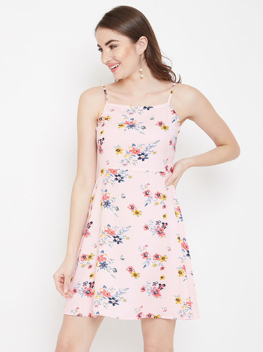 Berrylush Women Light Pink Self-Designed Square Neck Georgette Pleated Fit & Flare Mini Dress