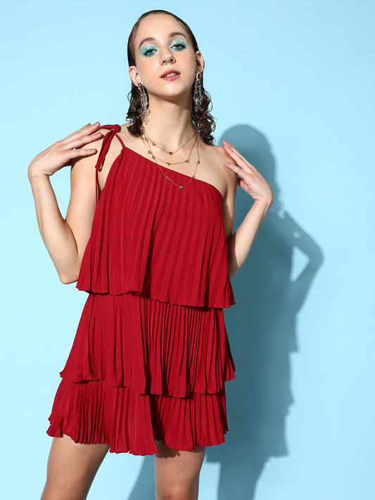 Berrylush Women Red Floral One Shoulder Belted Chiffon A-Line Mini Dress