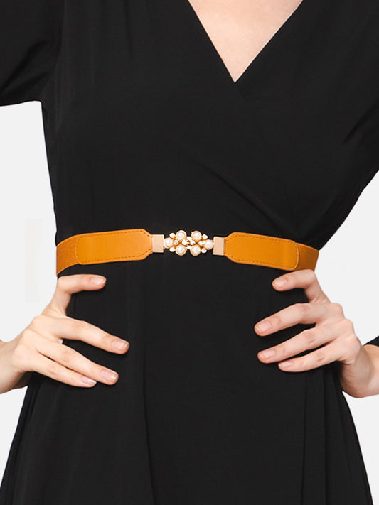 Berrylush Women Solid Brown Pearl Embellished PU Nylon Interlock Regular Slim Belt