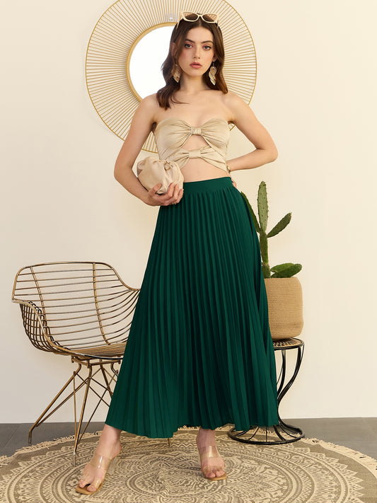 Berrylush Women Solid Green High-Rise Waist Slip-On Tulip Hem Front Thigh-High Slit Pleated Midi Skirt