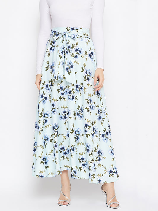 Berrylush Women Green Floral Printed Flared Tie-Up Maxi Skirt