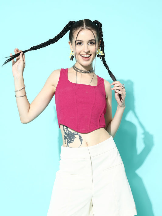 Berrylush Women Solid Pink Sweetheart Neck Front Tie-Up Crepe Cropped Top