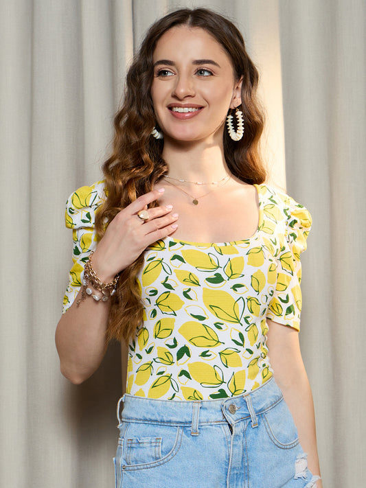 Berrylush Women Yellow & White Tie-Dye Printed Slim Fit Twisted Front Crop T-Shirt