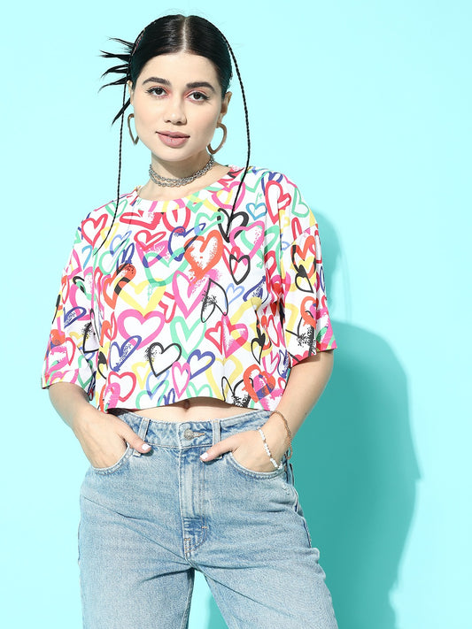 Berrylush Women White & Multicolour Heart Printed Round Neck Drop-Shoulder Sleeves Knitted Crop T-Shirt
