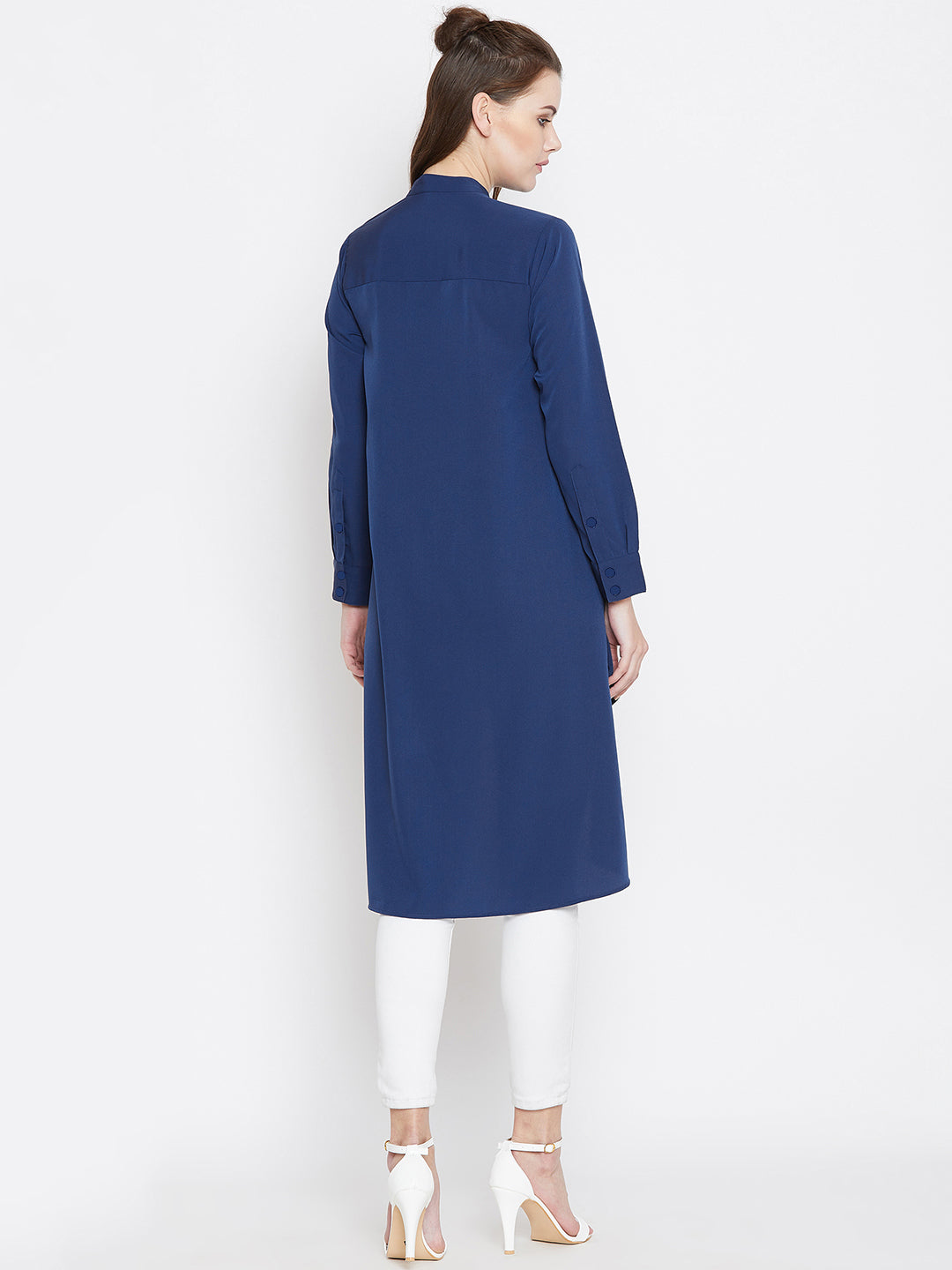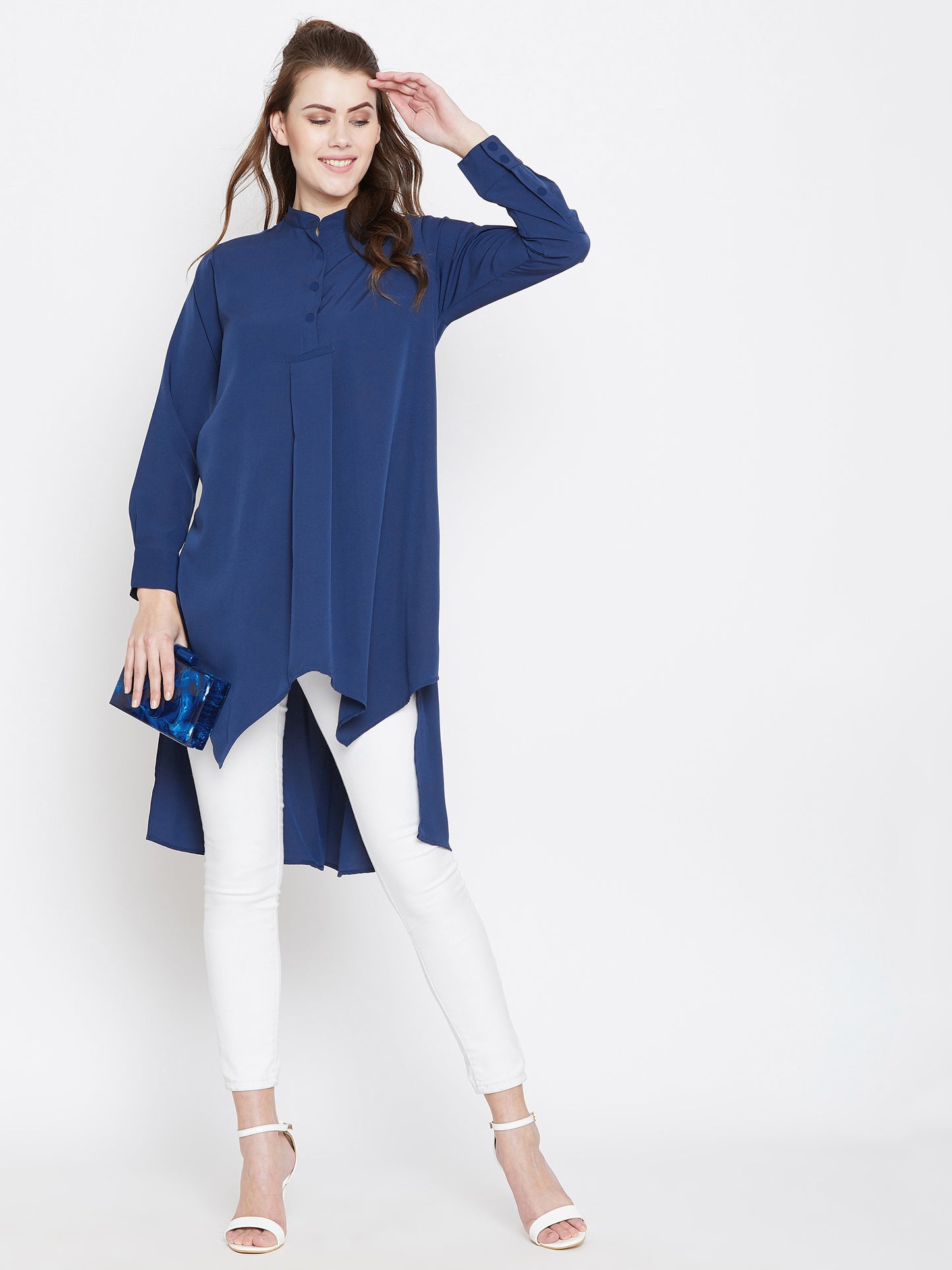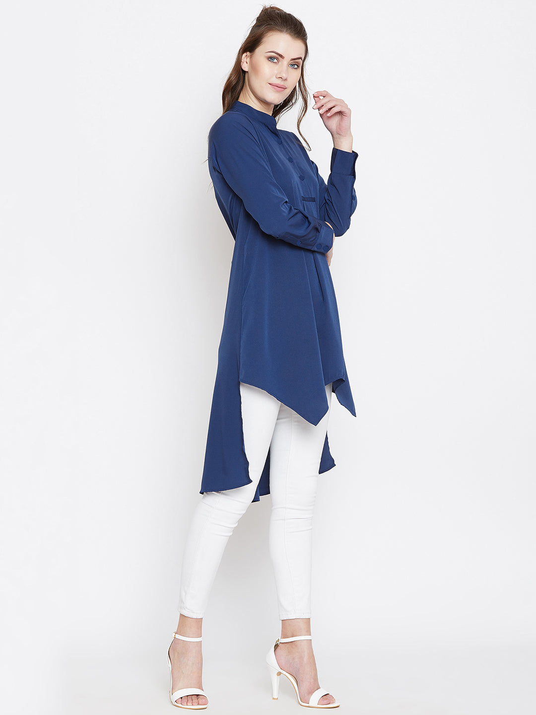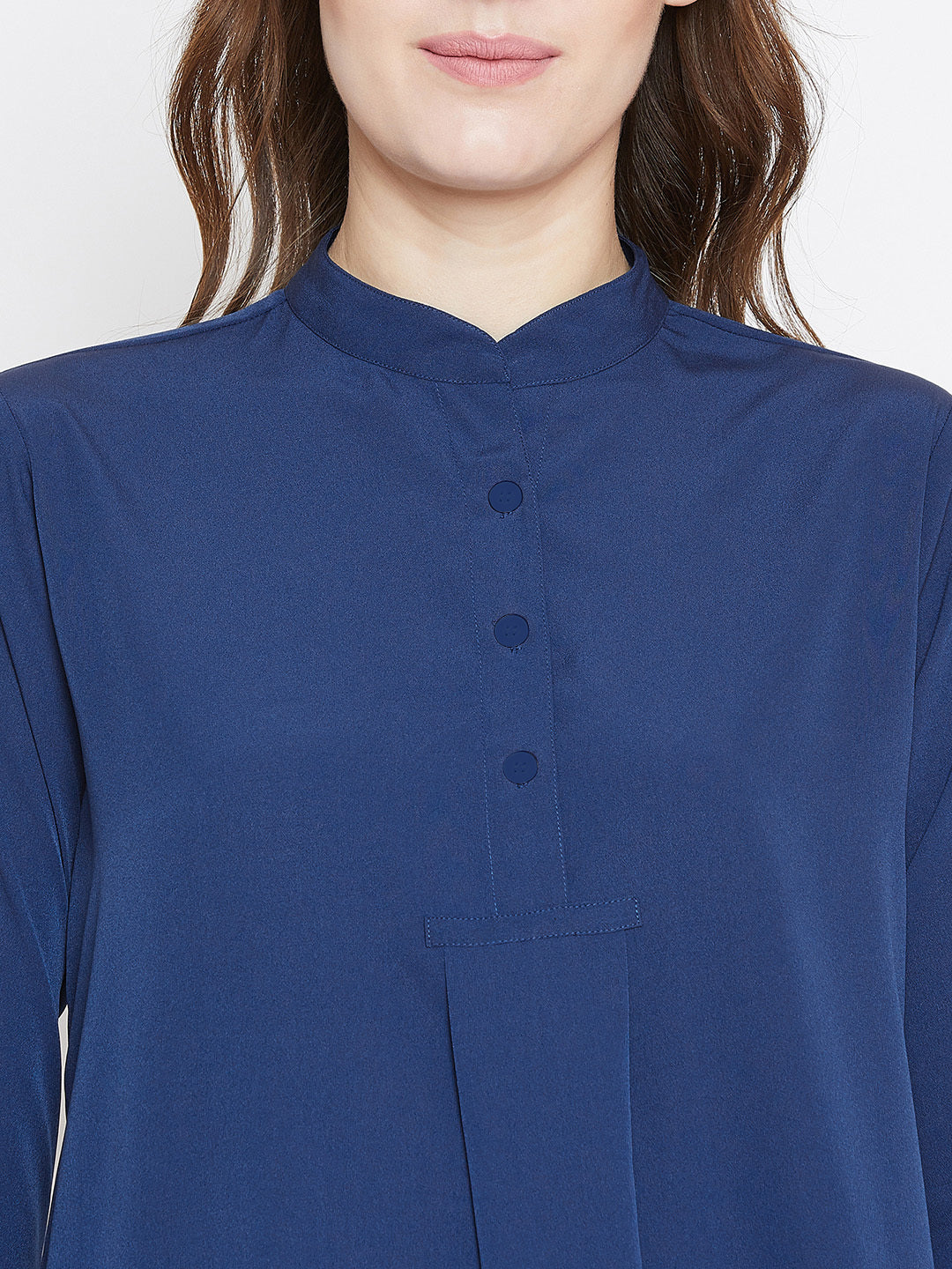Enhance your casual and basic style with this elegant Solid Blue Mandarin Collar High-Low Longline Top from Berrylush. This top gives your office look a game-changing style with its solid pattern and blue colour. The longline length accompanied with a high-low pattern gives exquisite appeal and the long sleeves with cuffed design make your arms look attractive. Crafted from crepe polyester fabric with woven detailing to make this top comfortable with a radiant finish. You can complete your look by pairing this longline top with white denim and matching flats.