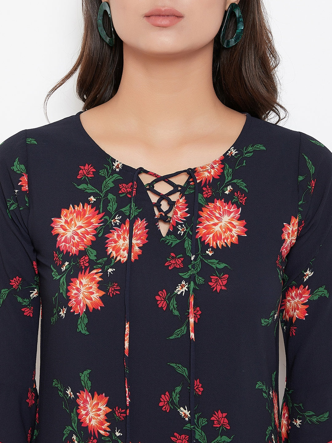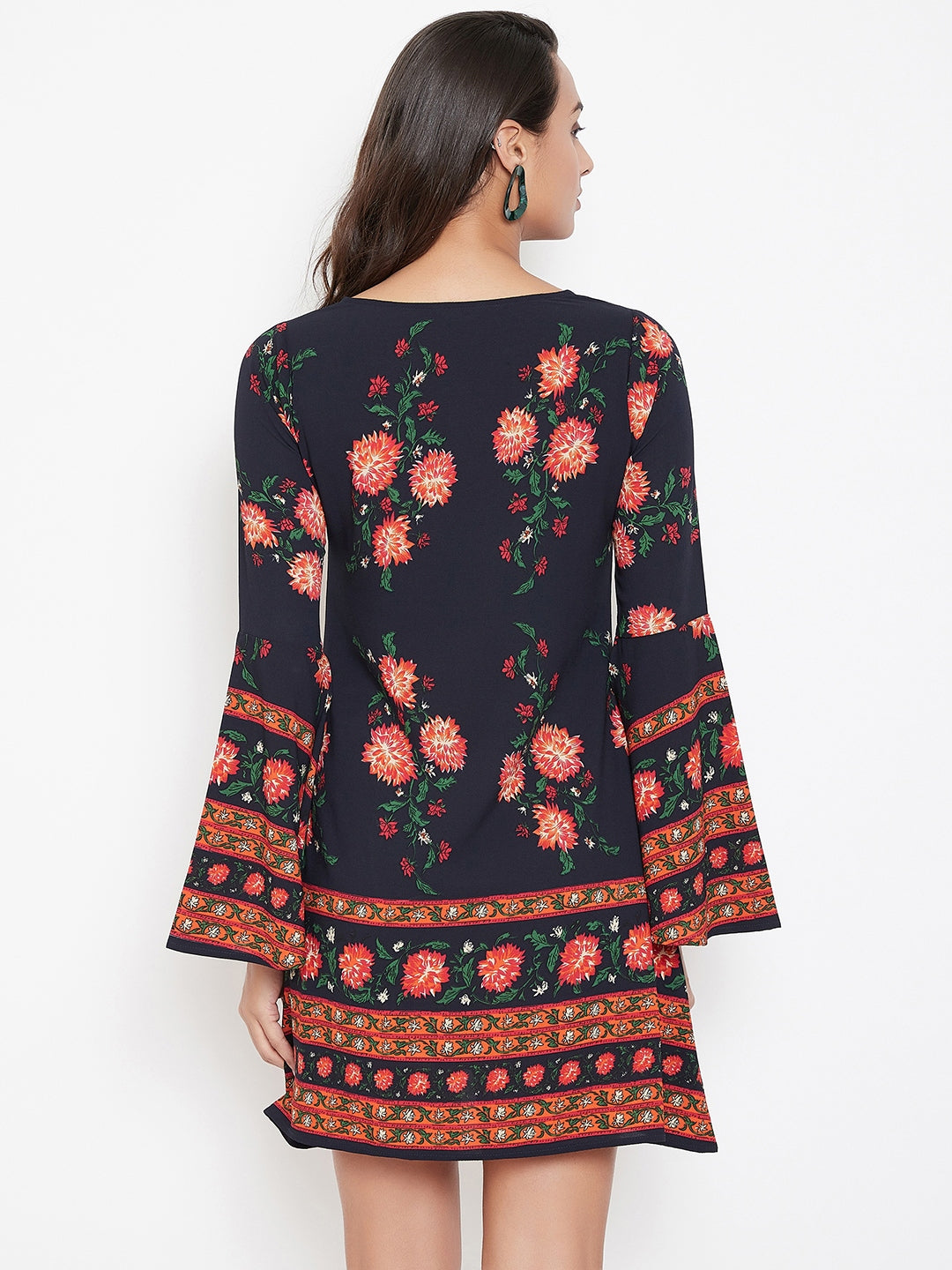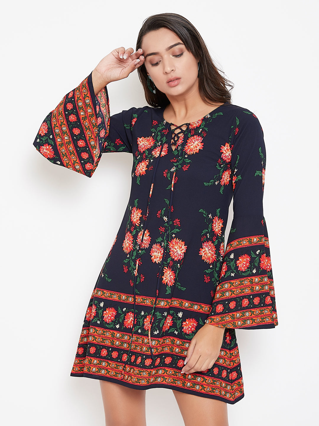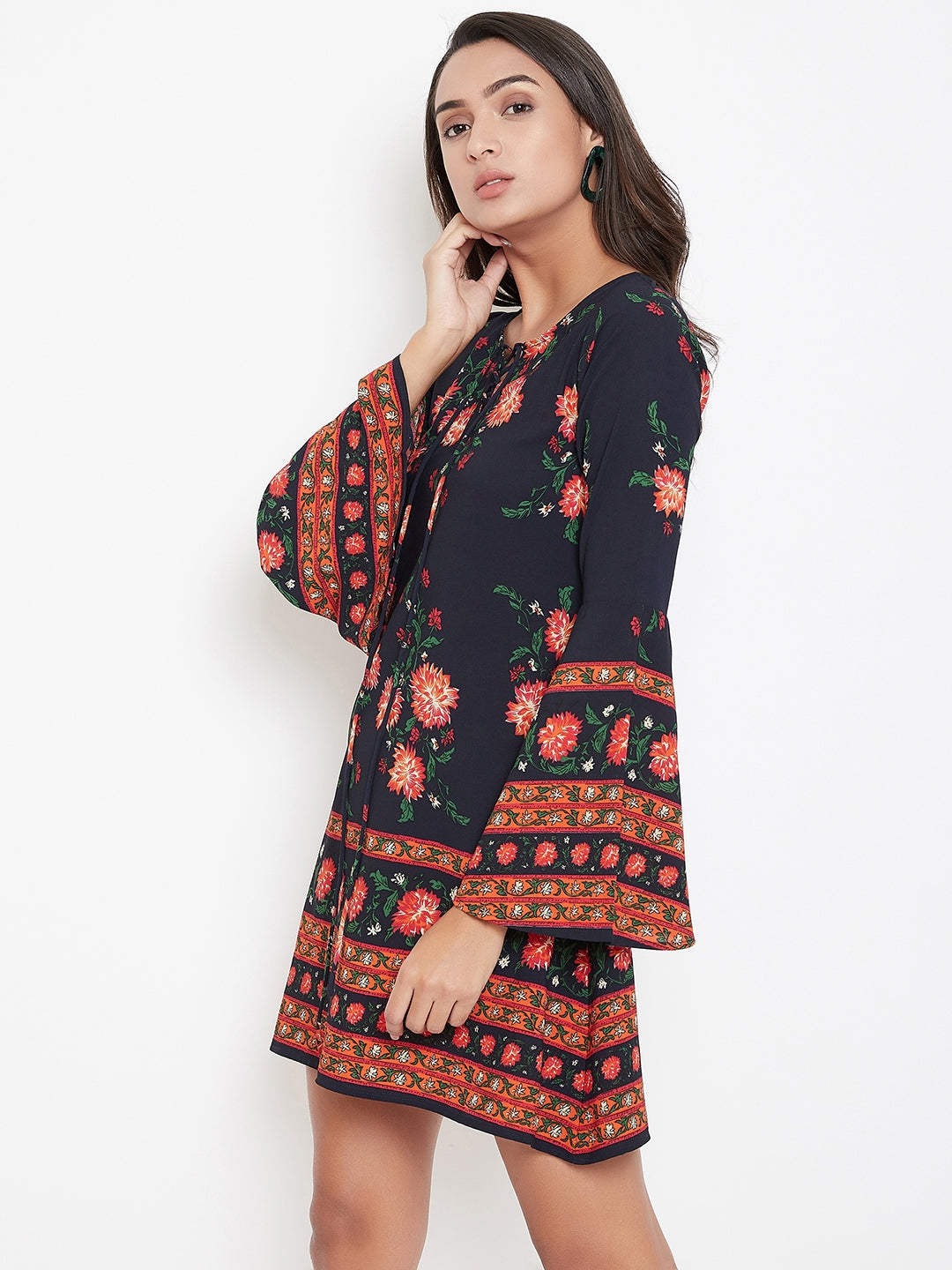 This summer add a fun and colourful vibe to your wardrobe with this Navy Blue & Orange Floral Printed Tie-Up Neck A-Line Mini Dress from Berrylush. The A-line skirt with a straight hemline makes this dress look attractive by giving a contouring fit to your body. The tie-up neckline makes your neck look pretty and bedazzling while the long bell sleeves of the dress give the arms a decorative view. The orange coloured floral print of the dress with navy blue colour tone enables you to stay tuned with the main floral trend and the crepe polyester fabric makes this dress wrinkle and stain-resistant. Match this mini dress with matching coloured flats and a sling bag for a captivating look.