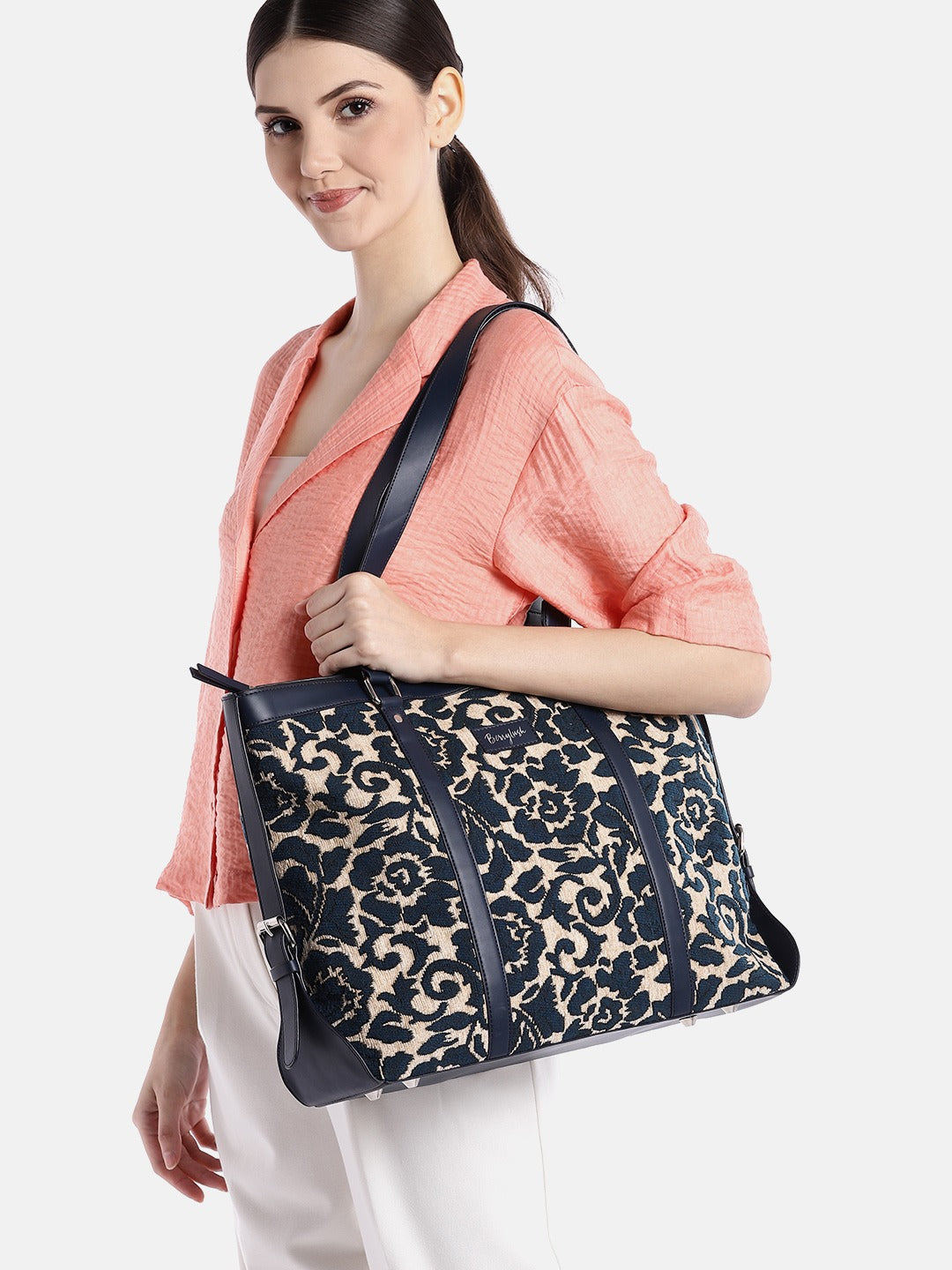 Get a hold on the perfect transitional laptop bag that goes well-versed for both office and outing occasions just like this fabulous Off White and Blue Floral Textured Structured Regular Laptop Bag designed by Berrylush. Adorned with a beautiful off-white and blue floral textured pattern that gives this bag a royal aesthetic appeal with a hint of classiness. Presenting two handles design for multipurpose usage while dividing the weight of the bag into two parts to avoid excessive load on the muscles while carrying it. Also, the zip compartment closure offers a secure and comfortable fastening process to this bag to ensure the safety of the items.