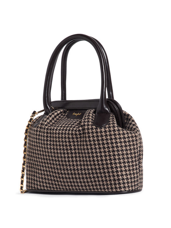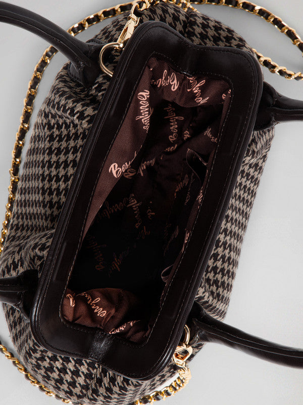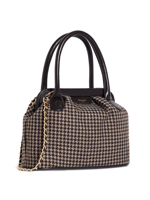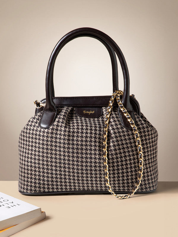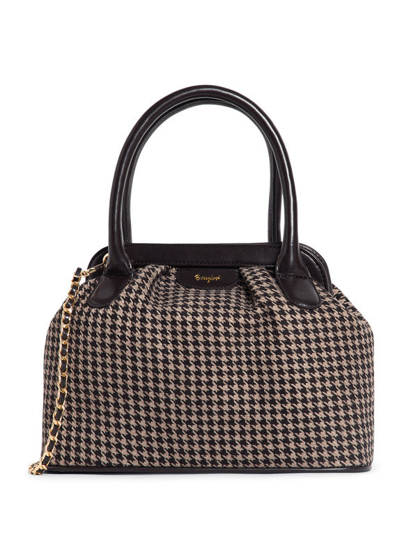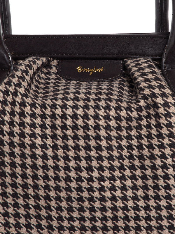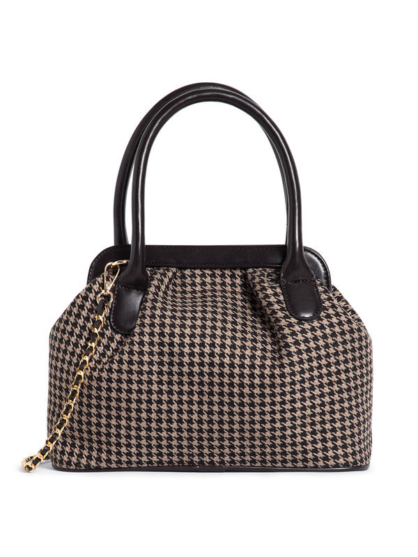 Berrylush Women Brown Houndstooth Printed Two-Handle Detachable Strap Embellished Handheld Bag
