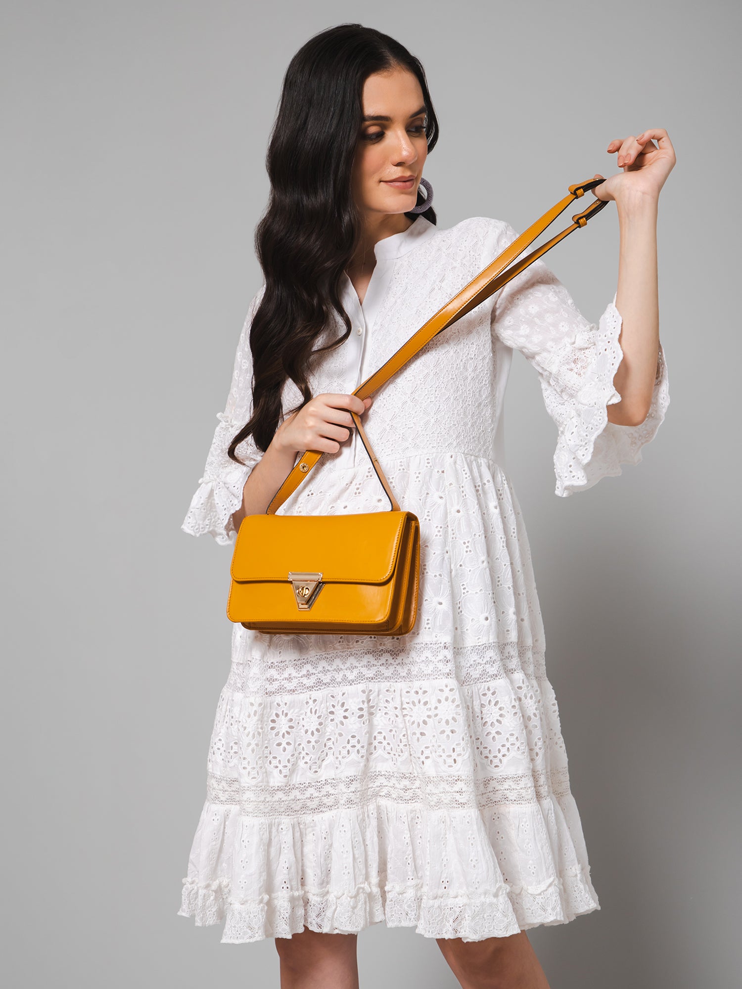 Give a chic touch to your accessory collection with an addition of subtle elegance by opting for this pretty Solid Yellow PU One-Handle Push Lock Embellished Shoulder/Sling Bag from Berrylush. This sling bag is a must-have for your casual repertoire as the beautiful amalgam of yellow colour and a solid pattern adjoins captivating detail. Flaunting stitched detailing at the front gives this bag a classy appeal and edgy finish. Moreover, push lock at the front and zipper compartment closures offer optimal security to your essentials. Partner this cute shoulder/sling bag with your favourite casual outfit to gracefully uplift your look.
