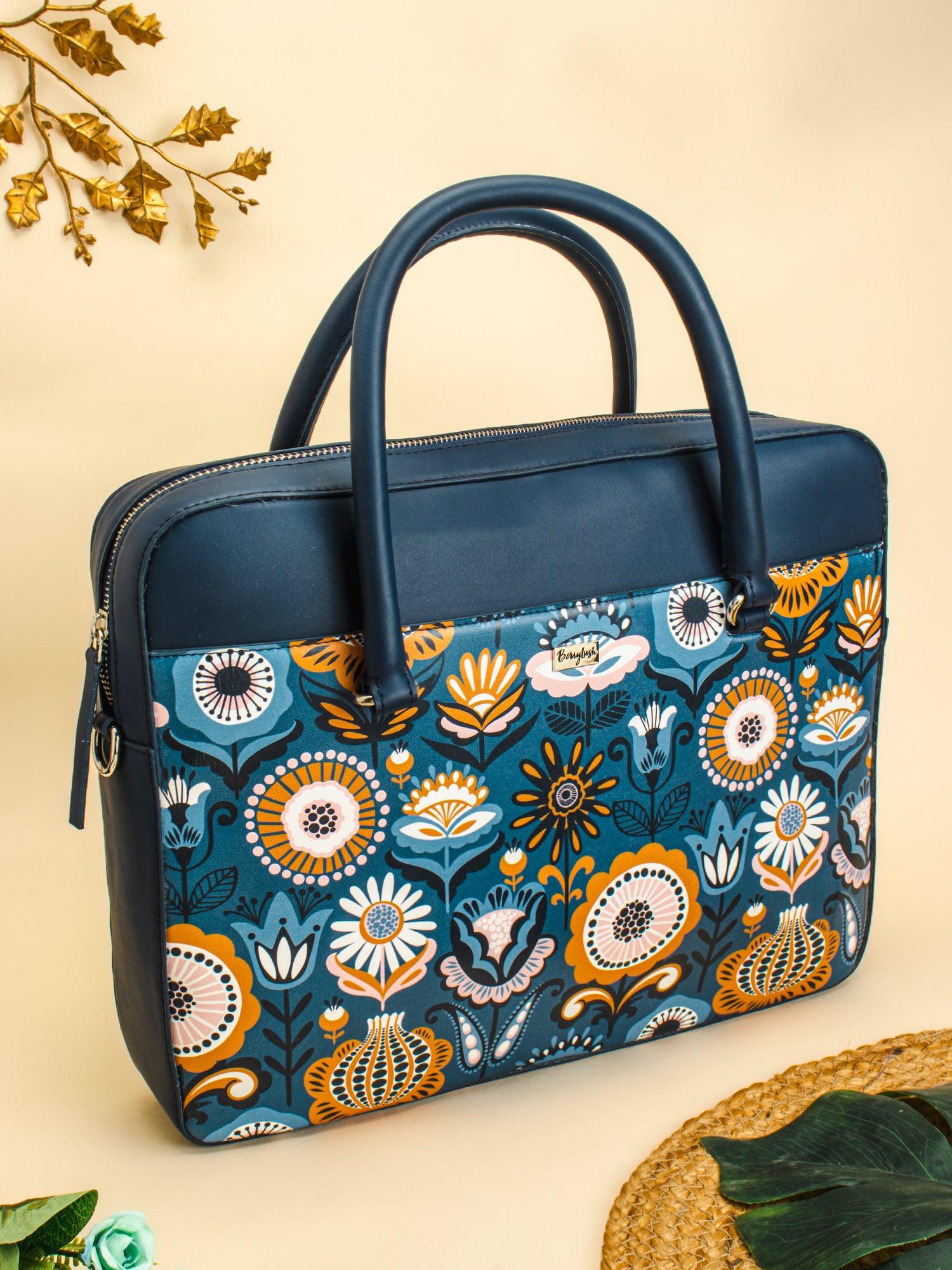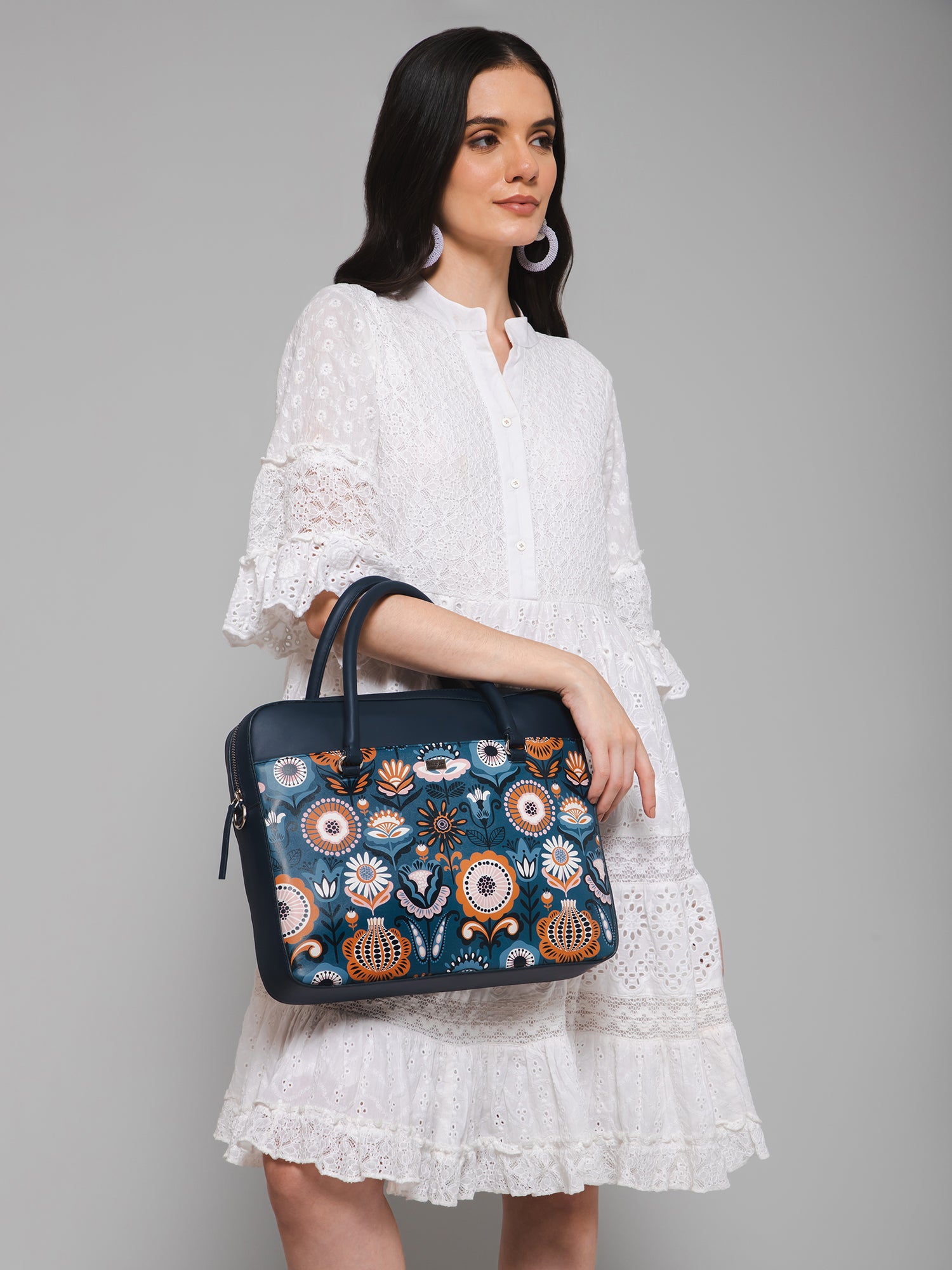 - Blue shade with graphic print gives this bag a feminine and chic appeal