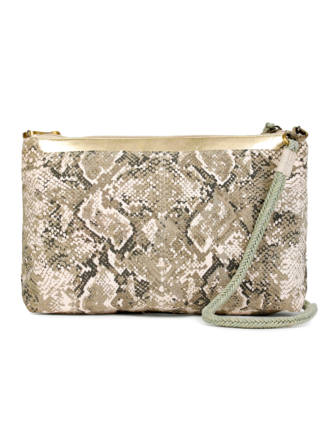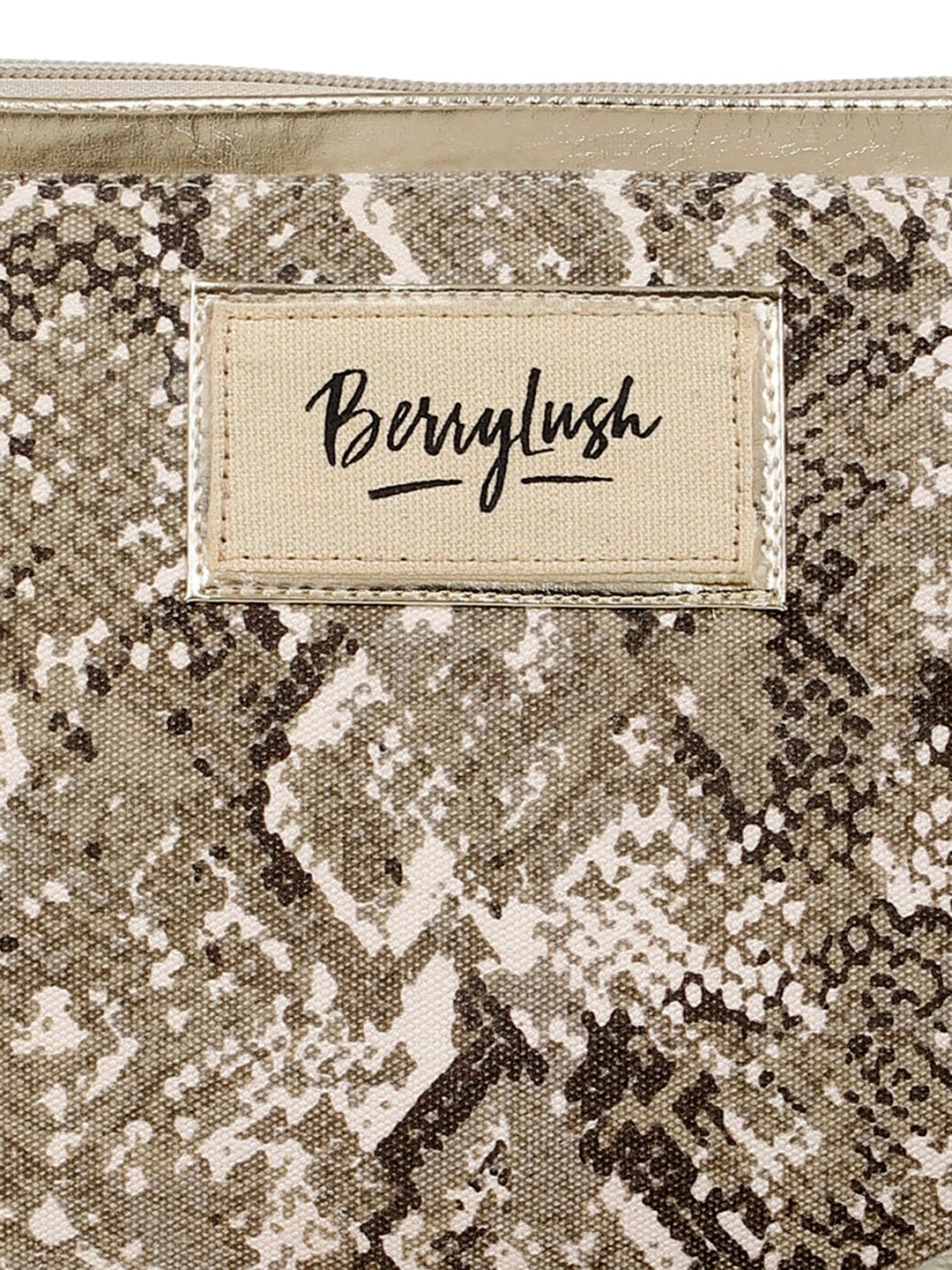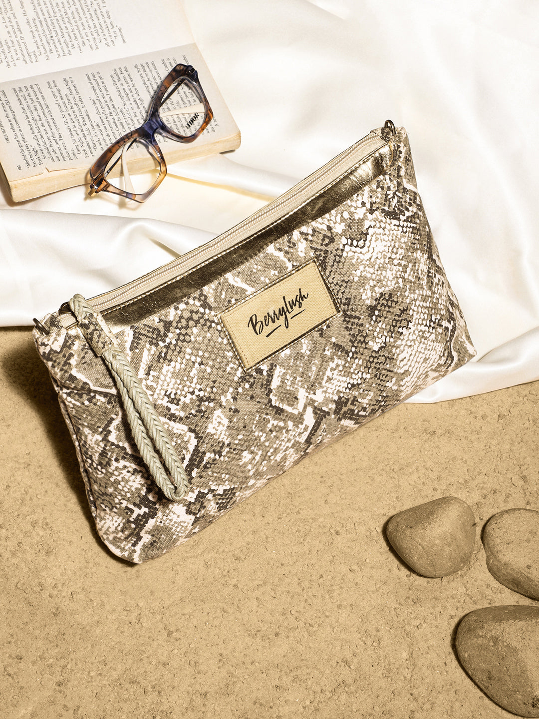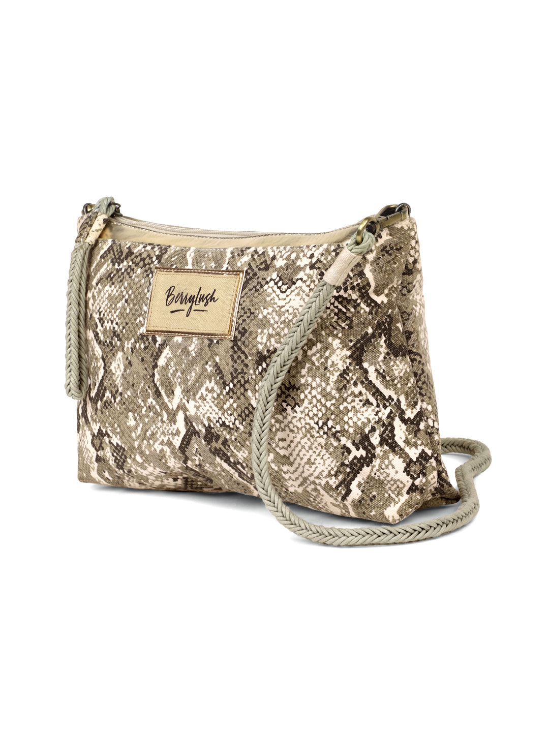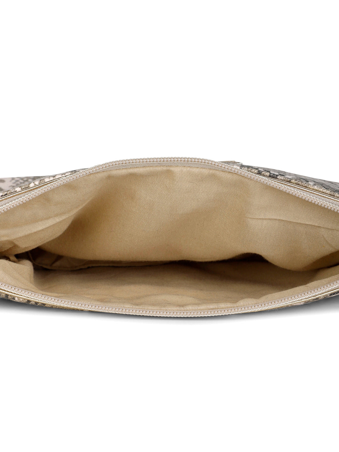 Berrylush Women White & Golden Snake Printed Canvas Detachable Sling Strap Small Clutch/Sling Bag