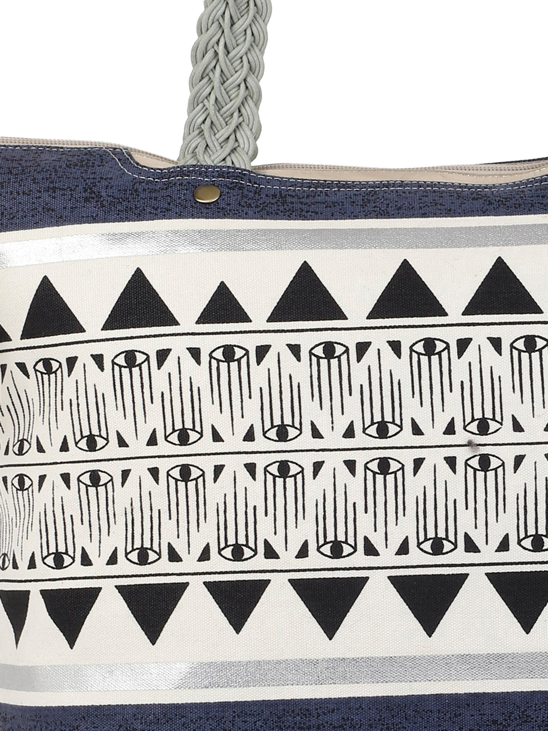 Berrylush Women Blue & White Ethnic Motifs Printed Canvas Zipper-Up Regular Tote Bag