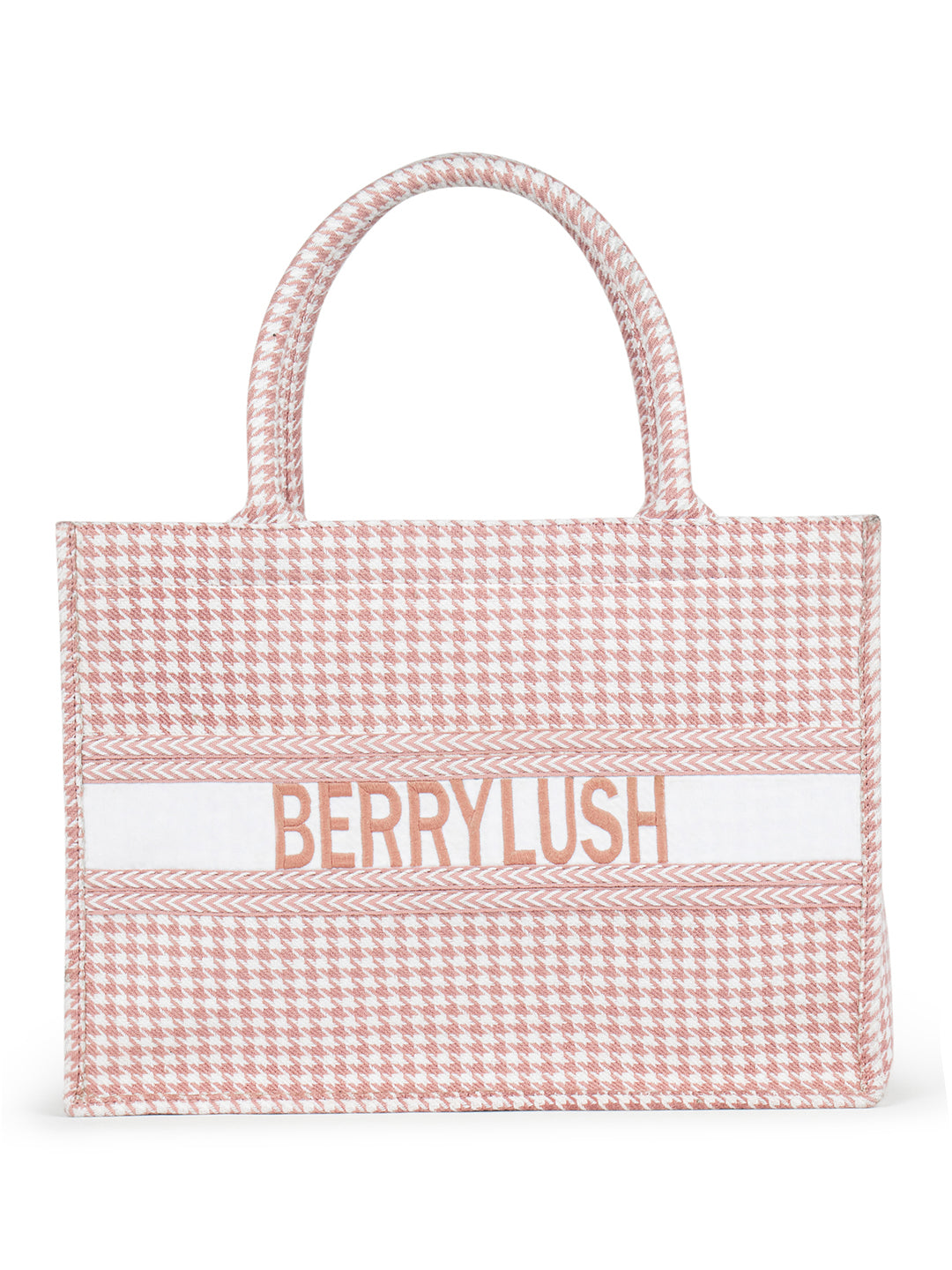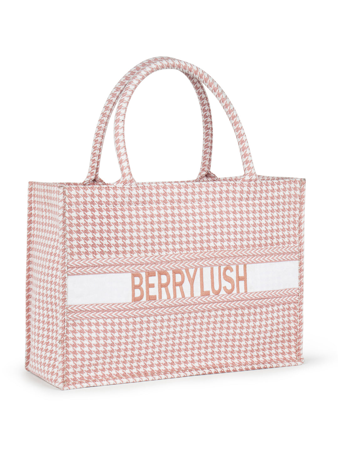 Berrylush Women Pink & White Houndstooth Printed Polyester Zipper-Up Embroidered Tote Bag