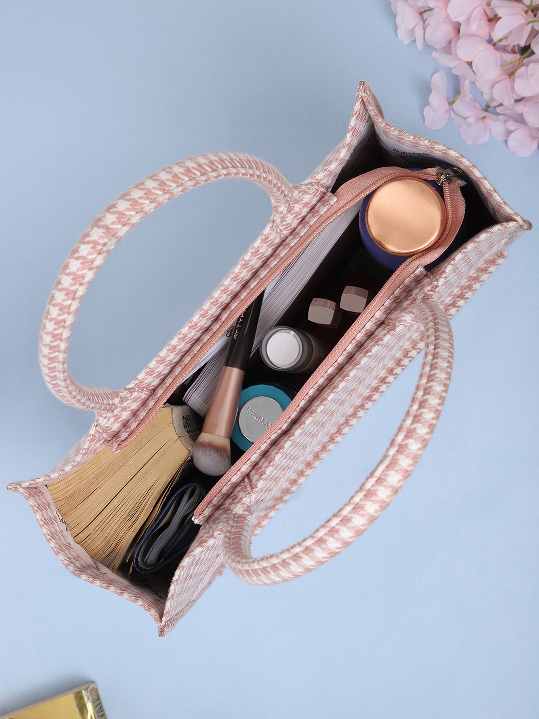 Use this Pink & White Houndstooth Printed Polyester Zipper-Up Embroidered Tote Bag from Berrylush for a modern and smart style. This bag is made from fine polyester material and has a pleasant houndstooth pattern in soft pink and white shades. It's perfect if you like old-fashioned things mixed with today's trends. The careful embroidered detailing makes it look better, so it's especially nice to wear on casual days out. This thing was built to work well. It has two handles so you can carry it easily, one big compartment shut with a zipper and another small pocket inside for neat stuff storage. Get a Berrylush bag and be stylish. This tote bag is perfect for anyone who loves fashion because it can do many things.
