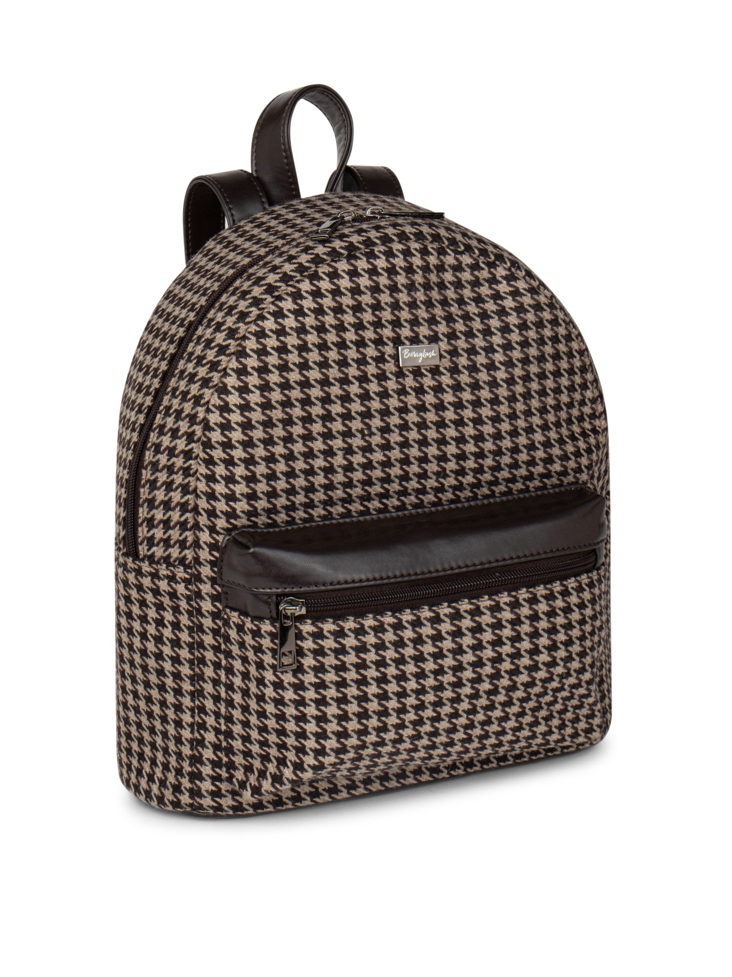 Berrylush Women Brown & White Houndstooth Printed Fabric Zipper-Up Regular Shoulder Backpack