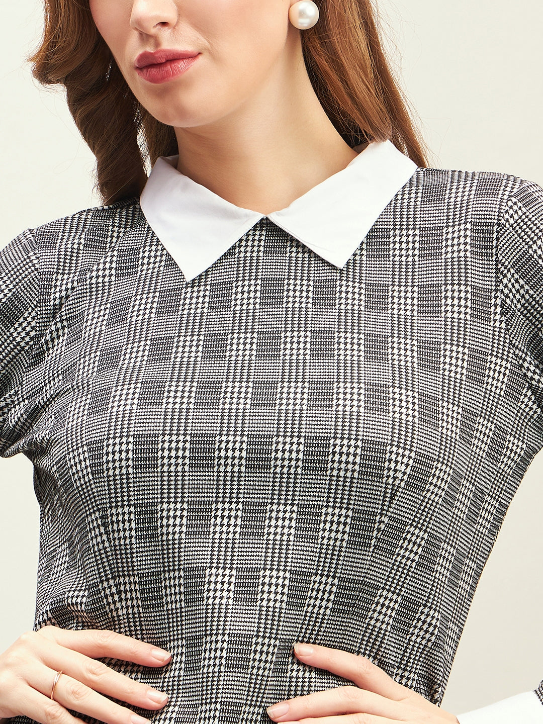 Berrylush BIZwear Women Black Houndstooth & Checked Print Contrast Collar Neck Straight Hem Knitted Bodycon Mini Dress