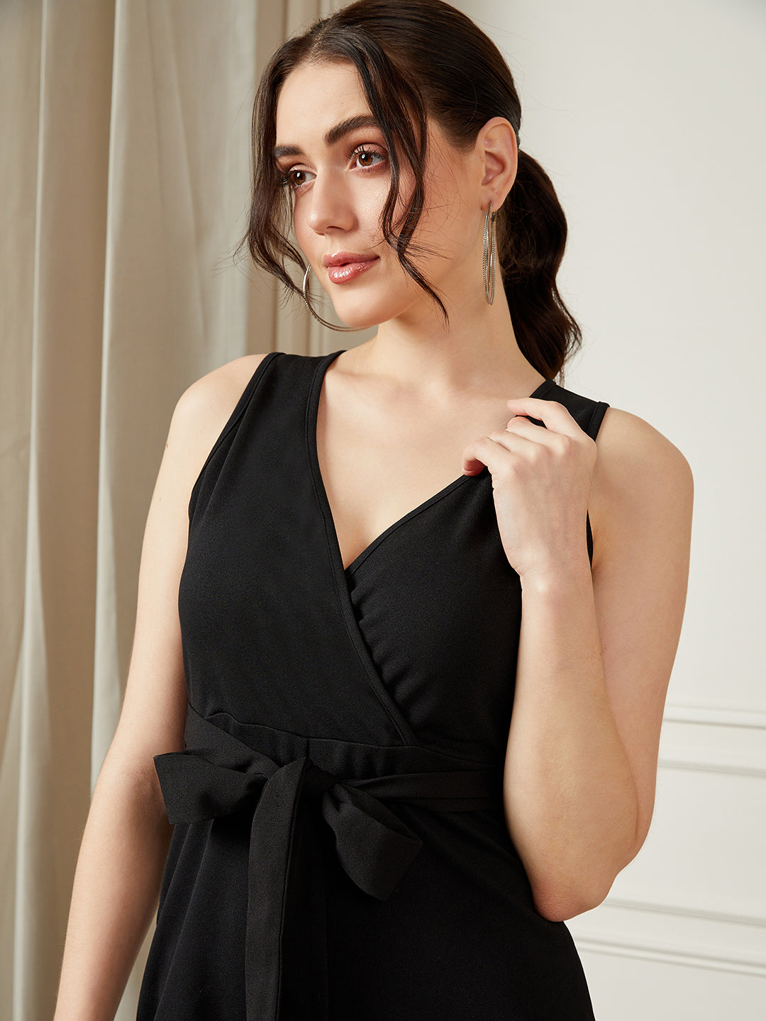 Berrylush BIZwear Women Solid Black V-Neck Sleeveless Tie-Up Waist Straight Hem Ankle Length Jumpsuit