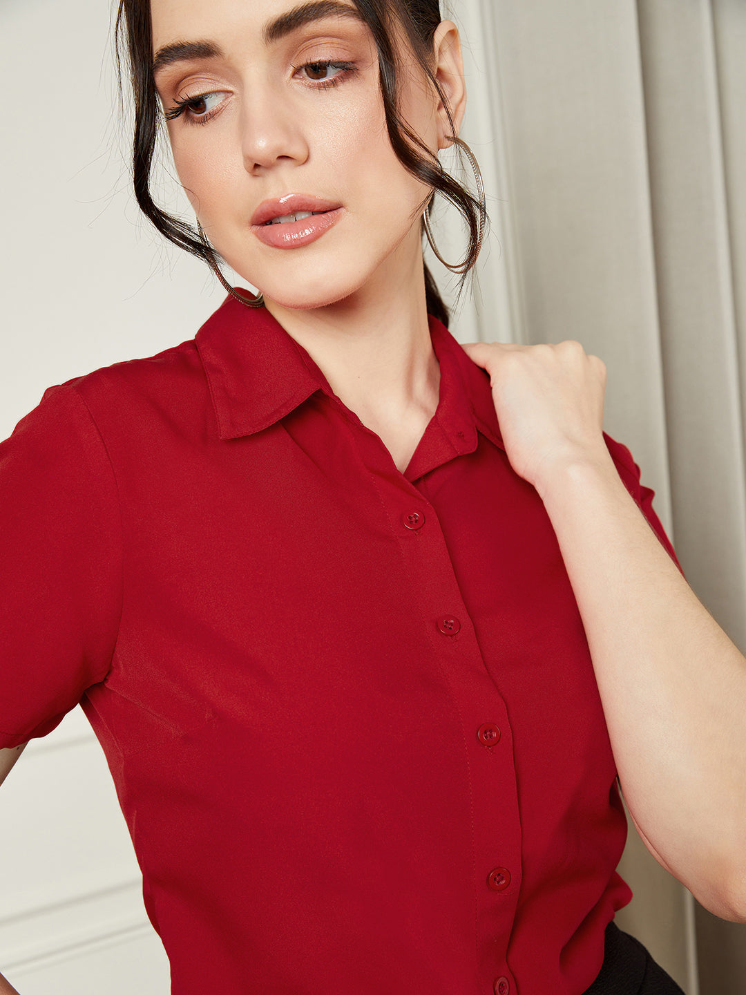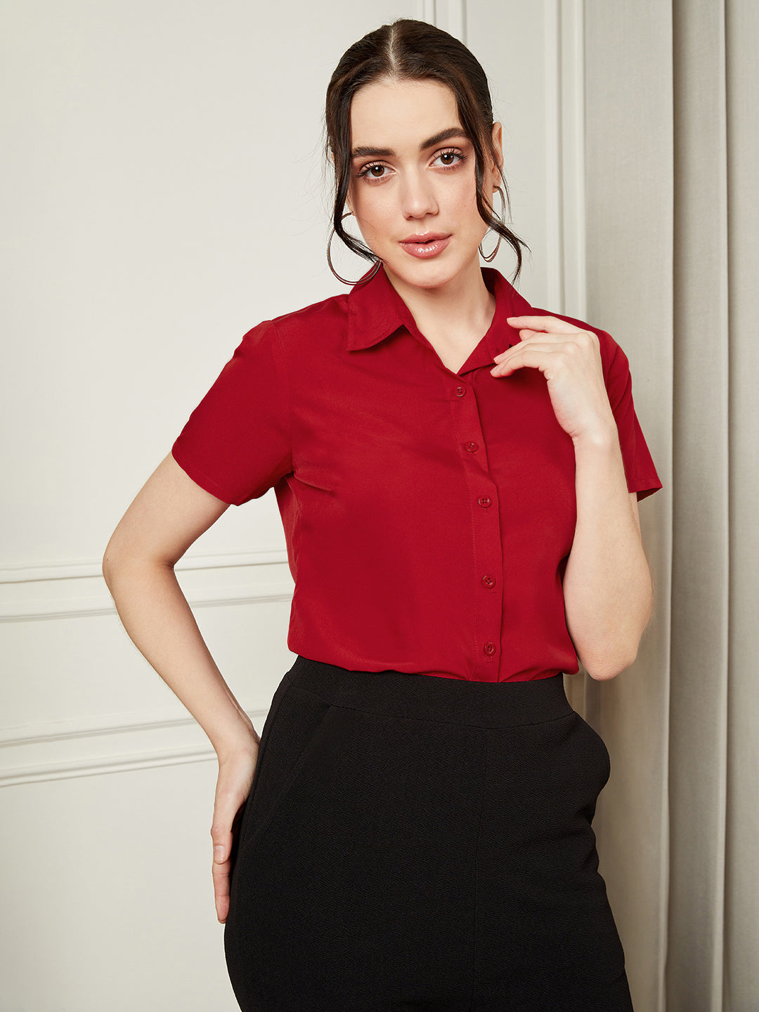 Berrylush BIZwear Women Solid Red Spread Collar Neck Front Button Curved Hem Regular Shirt
