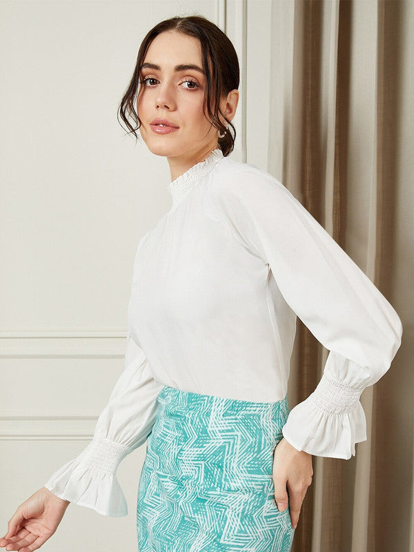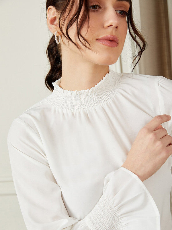 Berrylush BIZwear Women Solid White High-Neck Bell Sleeve Smocked Regular Top