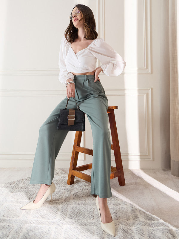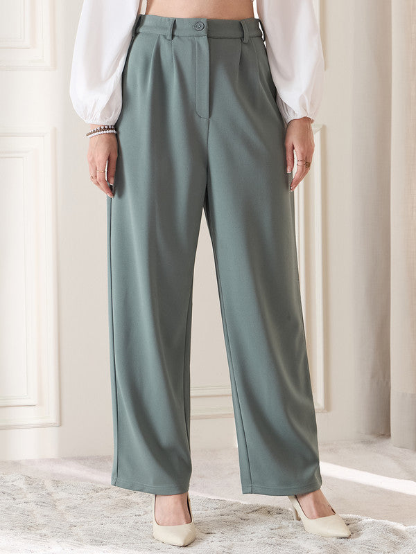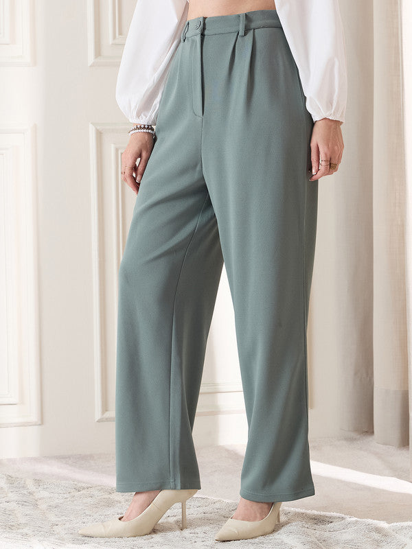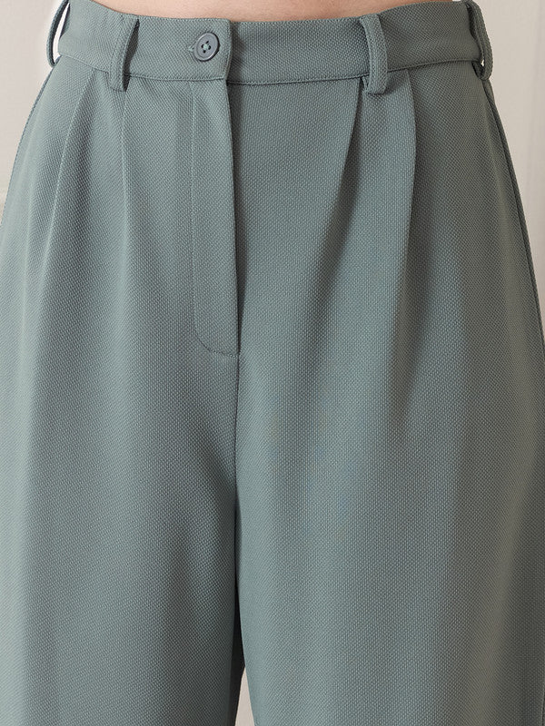 Berrylush BIZwear Women Solid Green High-Rise Waist Straight-Leg Front-Pleat Knitted Regular Trousers