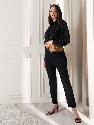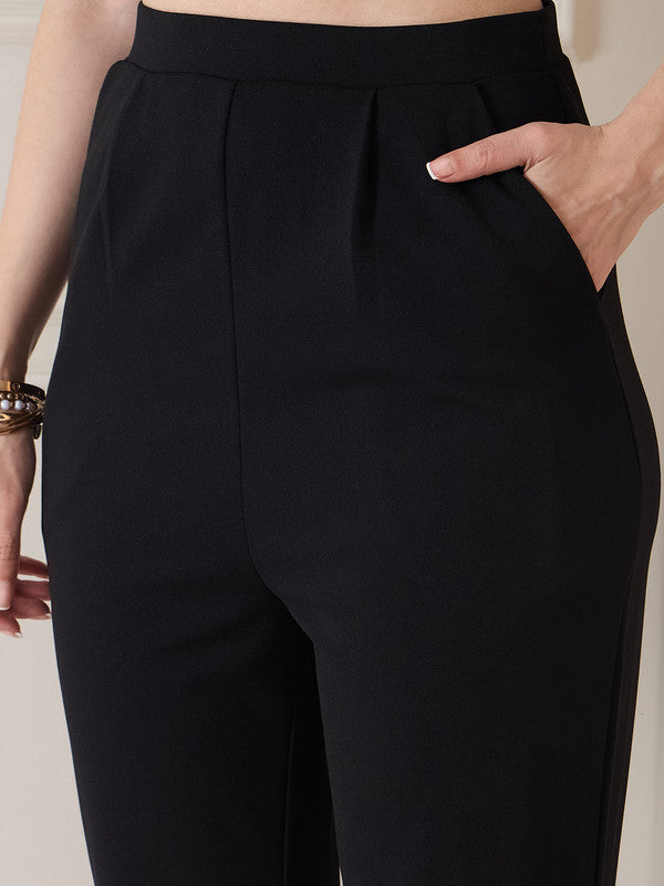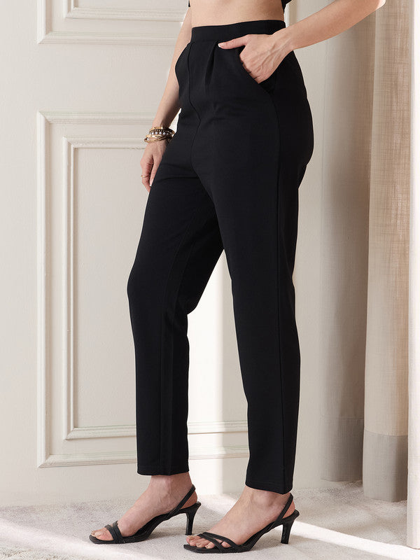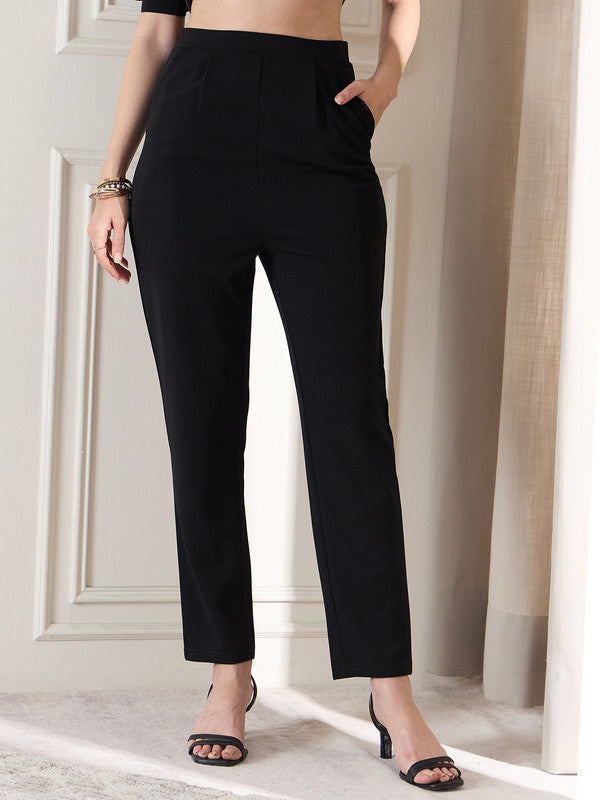 Berrylush BIZwear Women Solid Black High-Rise Waist Front-Pleat Skinny-Fit Slip-On Knitted Regular Trousers
