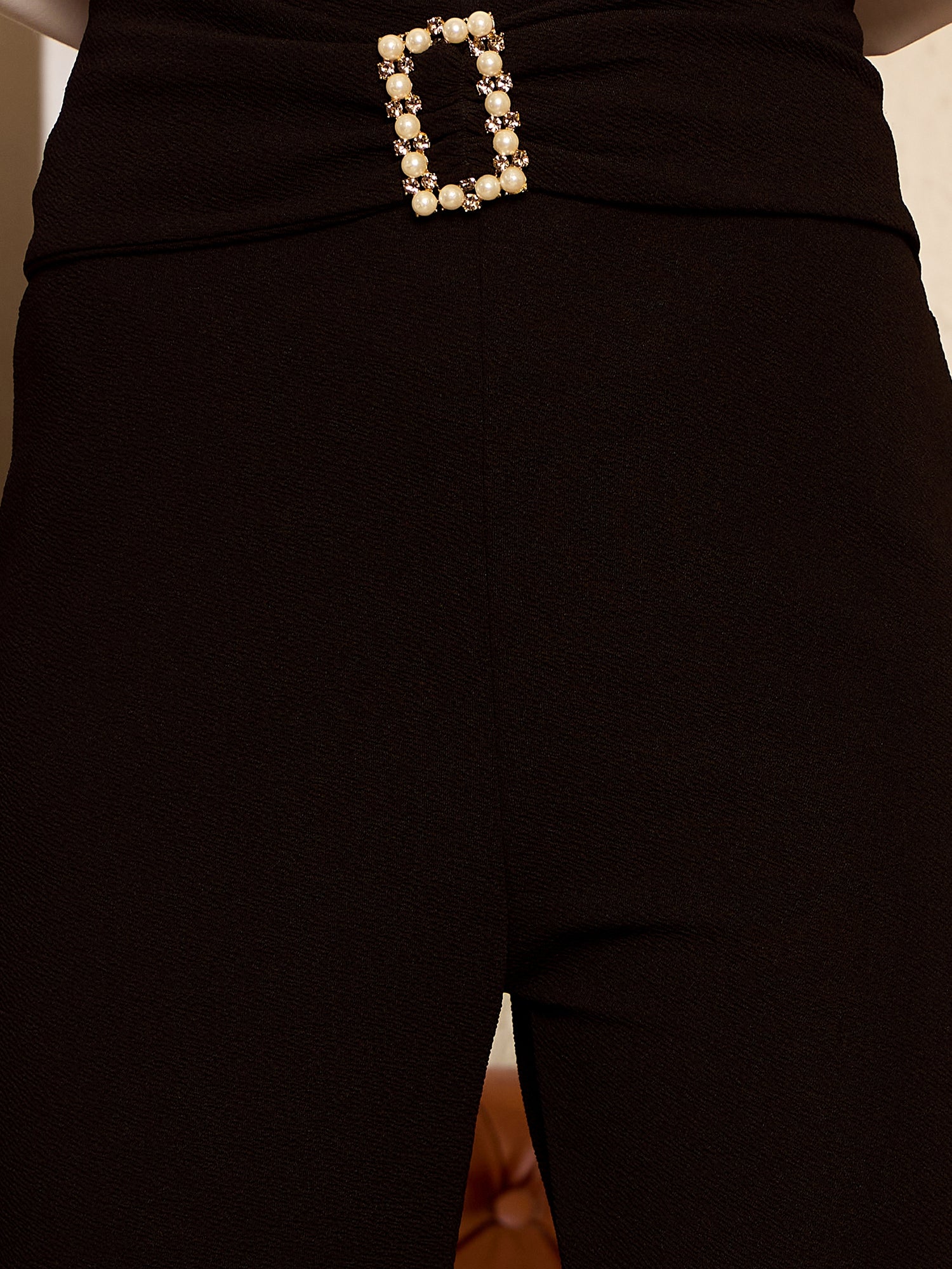 Achieve effortless sophistication with the Berrylush BIZwear Solid Black High-Rise Buckle Waist Flat-Front Pleat Cropped Trousers. Crafted from high-quality polyester, these trousers offer both comfort and sophistication for any professional setting. The high-rise design flatters your figure while ensuring a chic silhouette, making them an ideal choice for the modern professional. Featuring a unique buckle styling at the waist and a sleek zipper closure, these cropped trousers combine trendy aesthetics with practicality. Their solid black colour pairs beautifully with any blouse or tailored shirt, effortlessly transitioning from boardroom meetings to after-work gatherings. The opaque knitted weave ensures durability without compromising on style or fit - perfectly jogged pleats enhance elegance without sacrificing comfort!