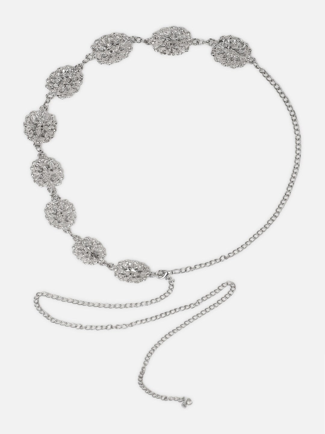 Experience the perfect blend of style and grace with Berrylush's Silver-Toned Metal Slim Interlock Embellished Chain Belt. Carefully crafted from premium metal, this slim-width belt serves as a versatile accessory to amp up your casual wardrobe. The interlock closure guarantees a secure fit while its embellishment detailing offers an irresistible allure. Perfect for any occasion, this stunning chain belt will undoubtedly add an eye-catching sparkle to your look!