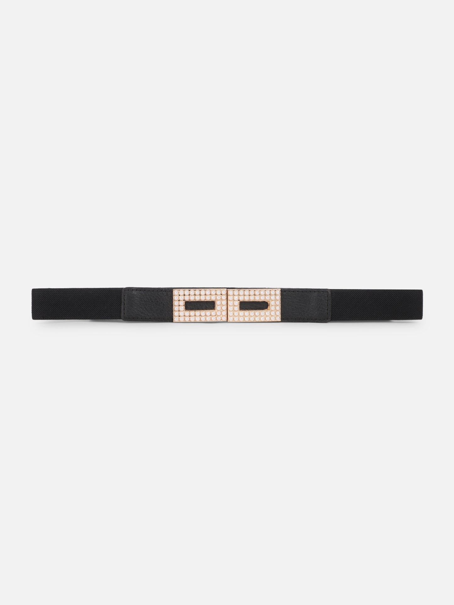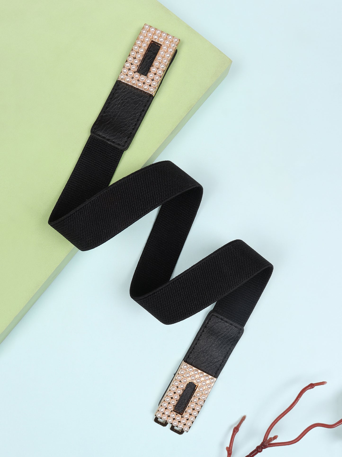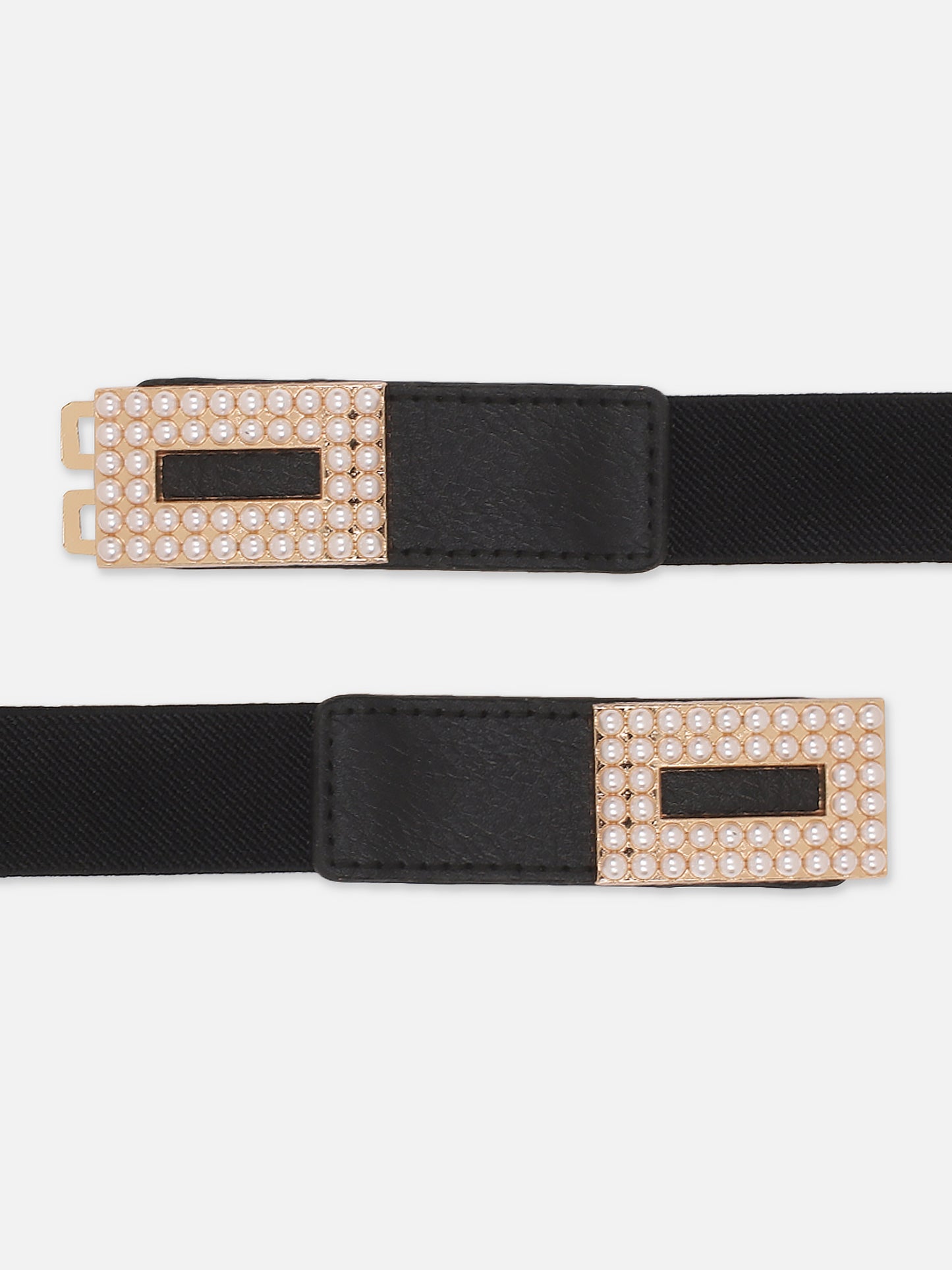 Berrylush Women Solid Black Golden Embellished Pearl Studded PU Nylon Interlock Regular Slim Belt