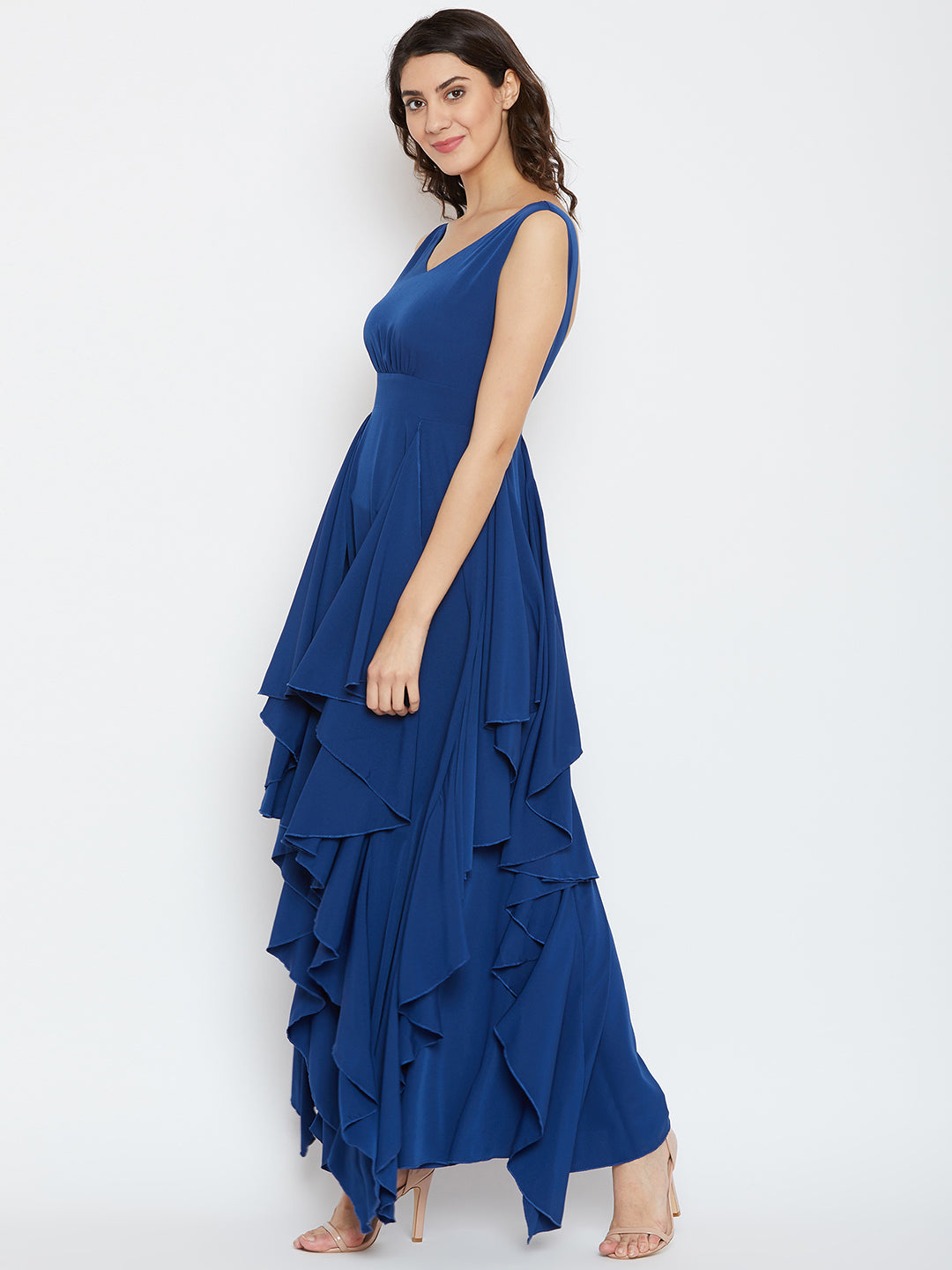 Berrylush Women Solid Blue V-Neck Sleeveless Open-Back Ruffled Maxi Dress