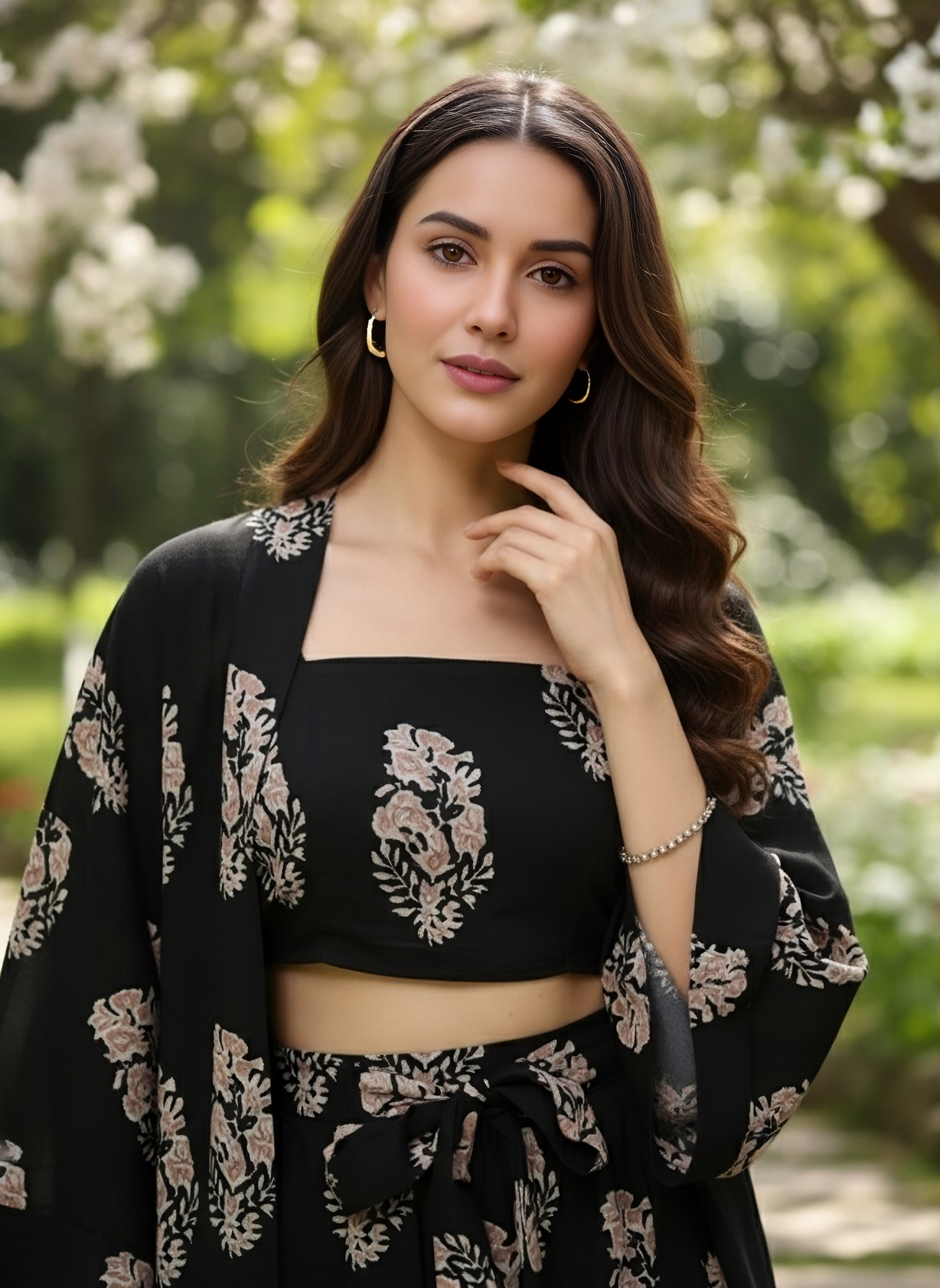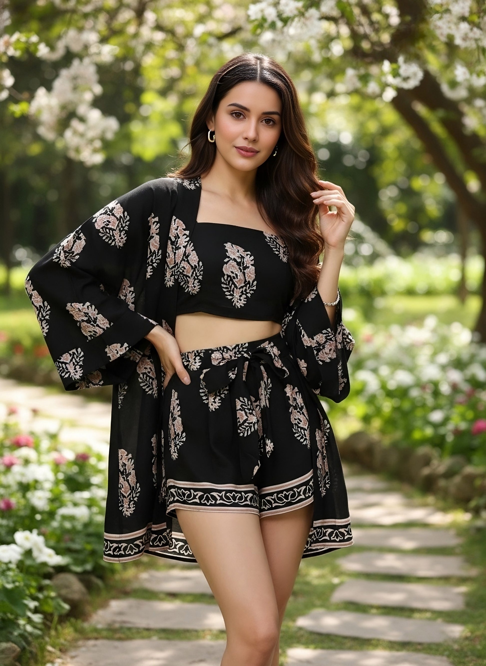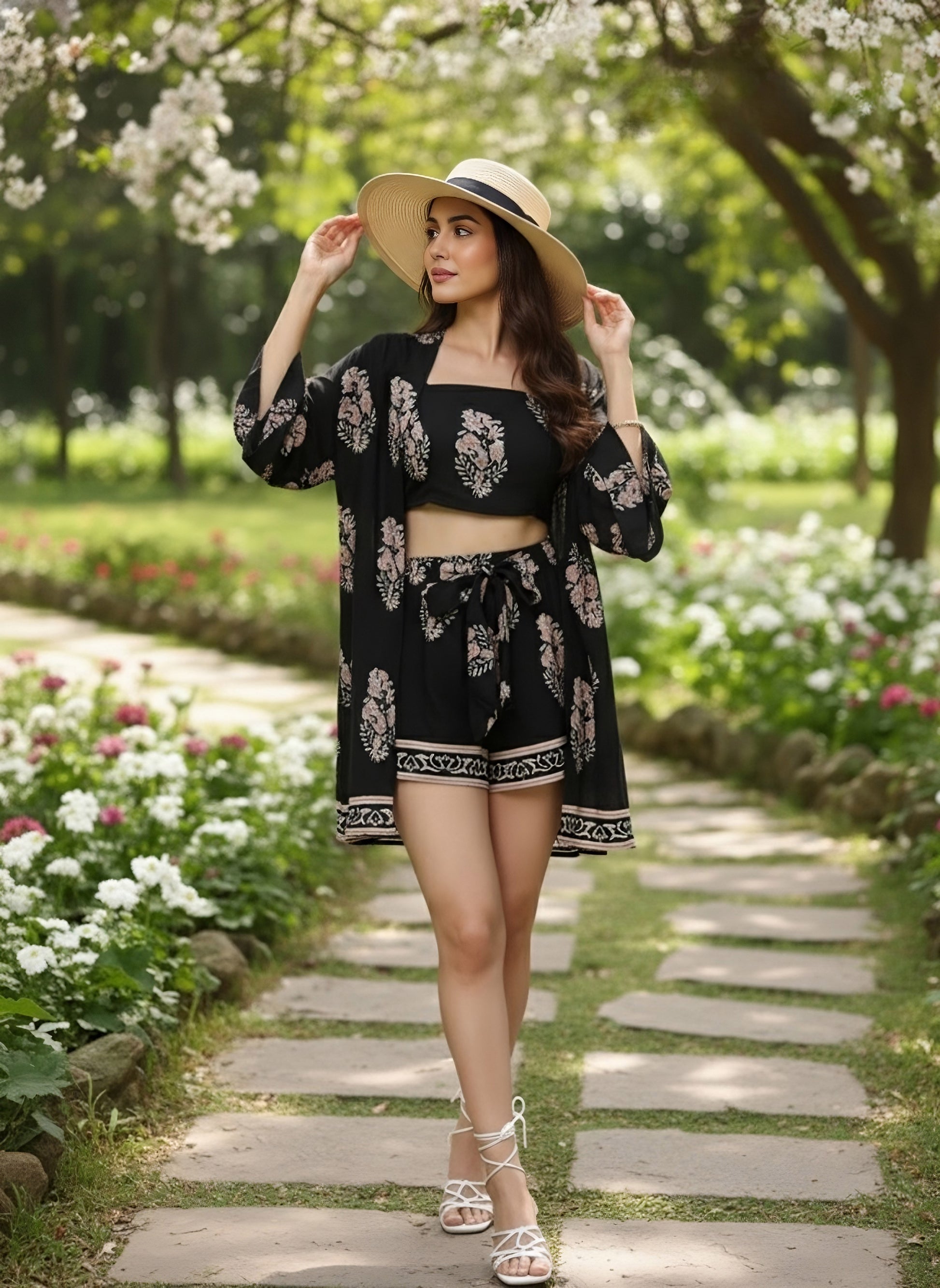 Bring in the bohemian vibe and voguish fashion factor within your vacation closet by wearing this Black & White Paisley Printed Crop Top & Tie-Up Front Shorts With Kimono from Berrylush. This co-ord set steals the spotlight with the amazing amalgam of black shade with a cream-coloured paisley print that adds a hint of nature's beauty while giving away a tropical vibe. Spun from polyester fabric to keep this co-ord set lightweight and breathable for offering limitless comfort. In addition, the above knee length of the shorts ensures keeping your legs cool with uninterrupted movements. Partner up this co-ord set with a pair of matching flip-flops, cute earrings, and a black side bag to create a fashion-focused appearance.