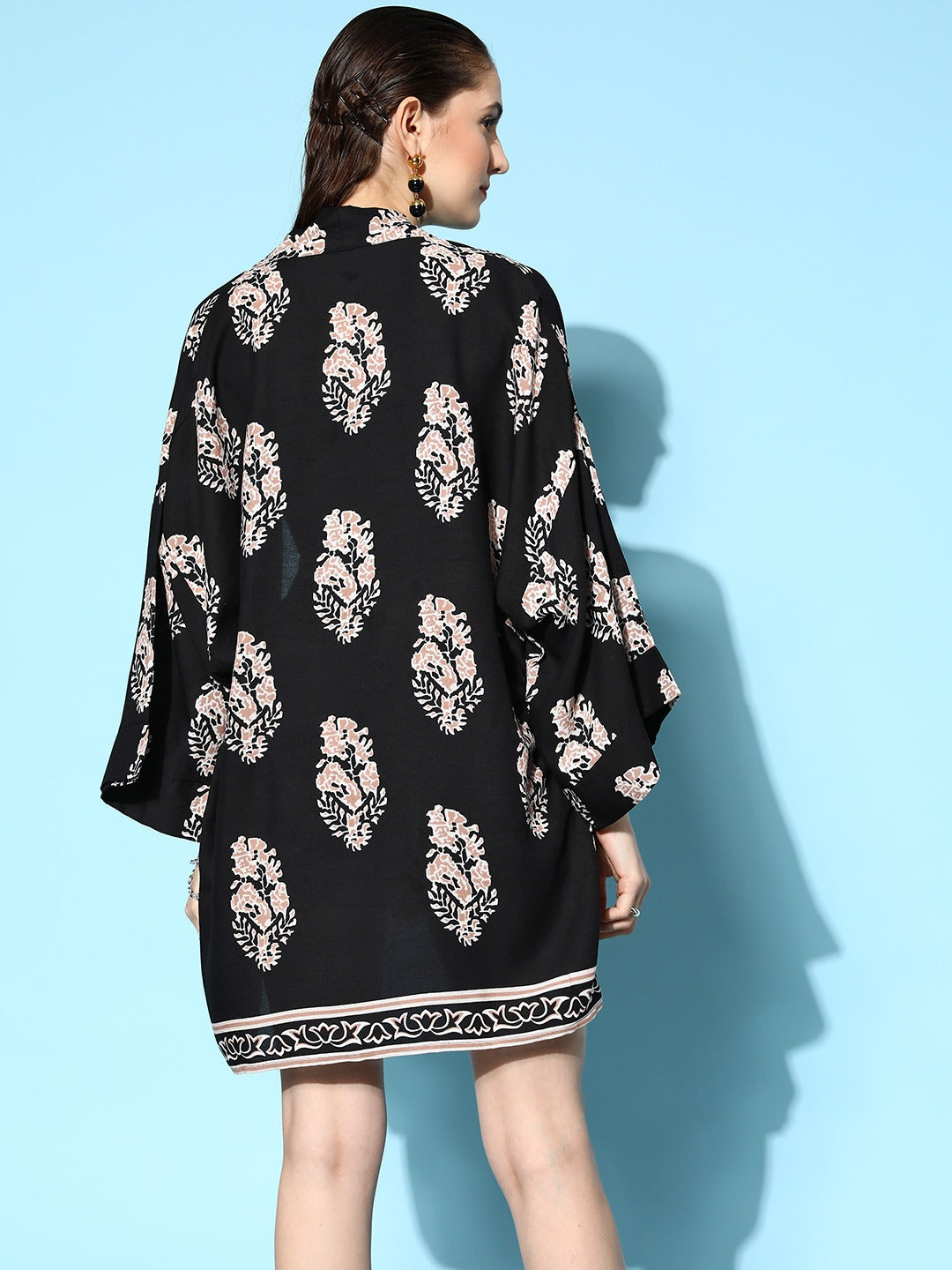 Berrylush Women Black & White Paisley Printed Crop Top & Tie-Up Front Shorts With Kimono