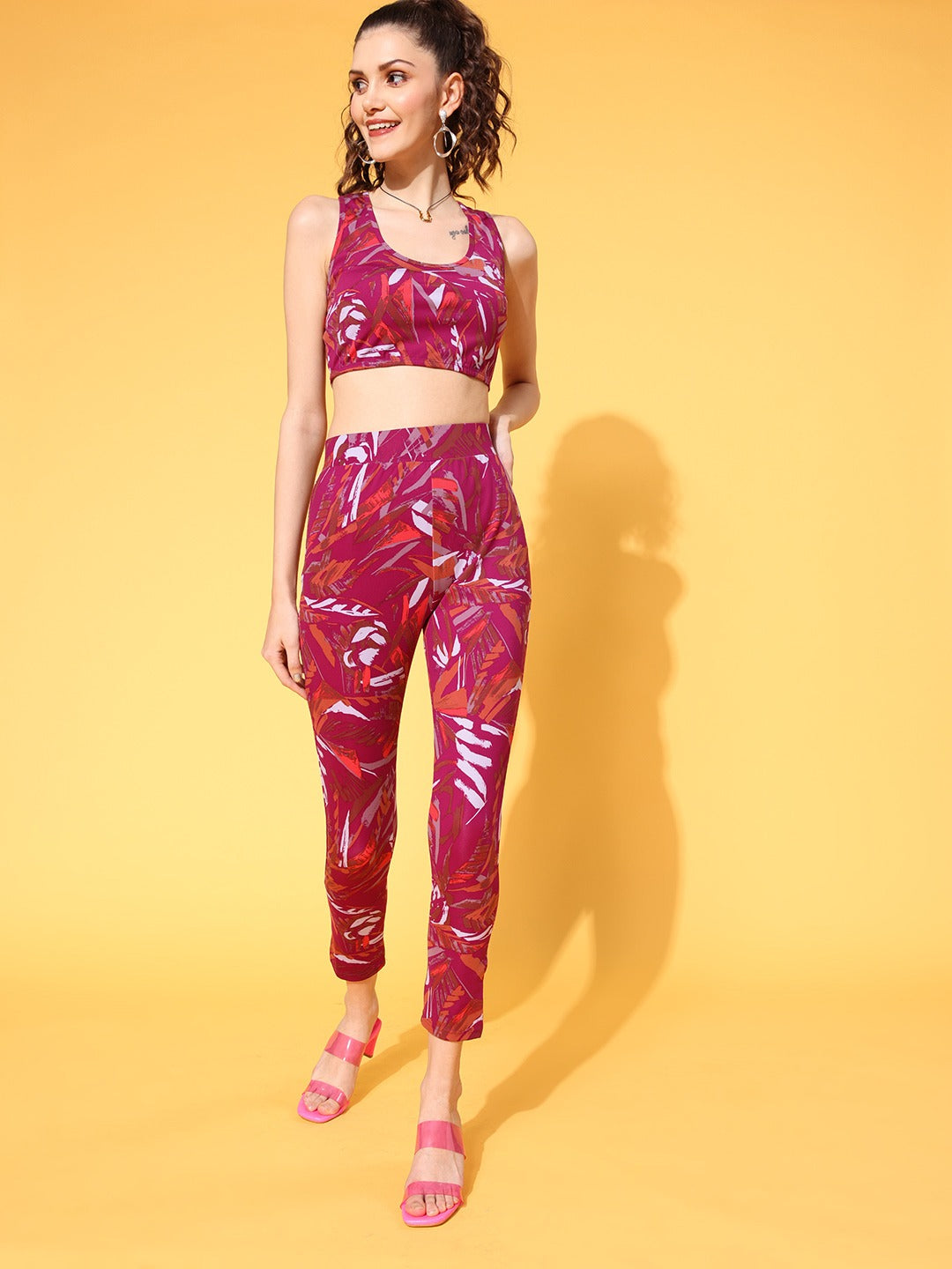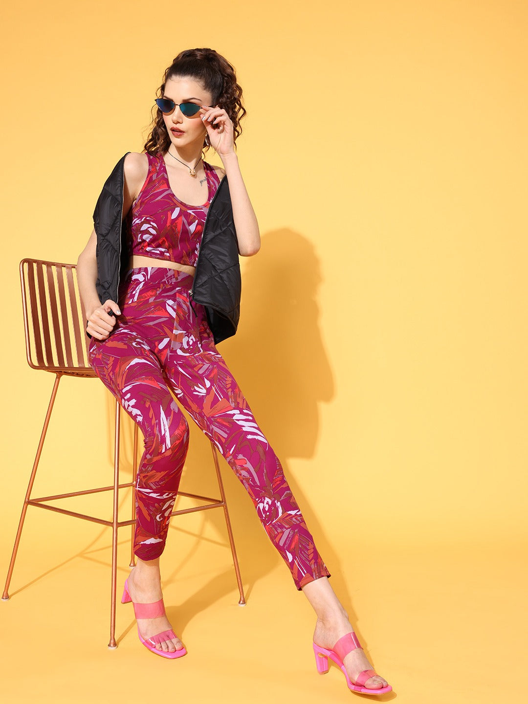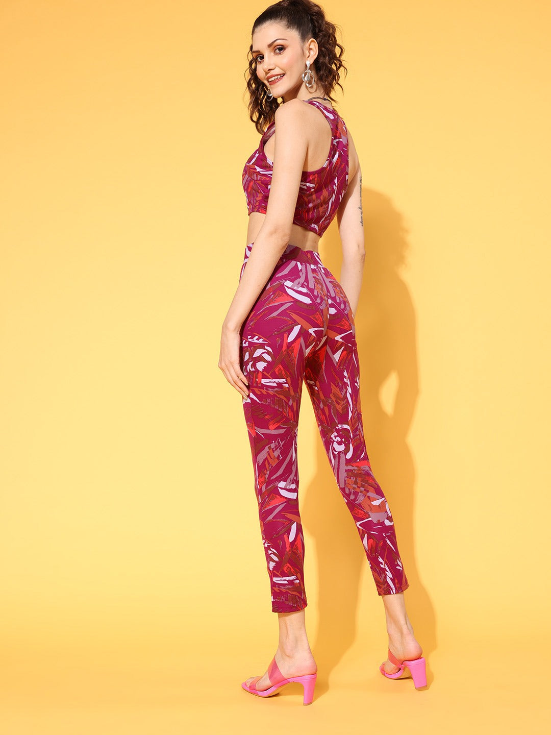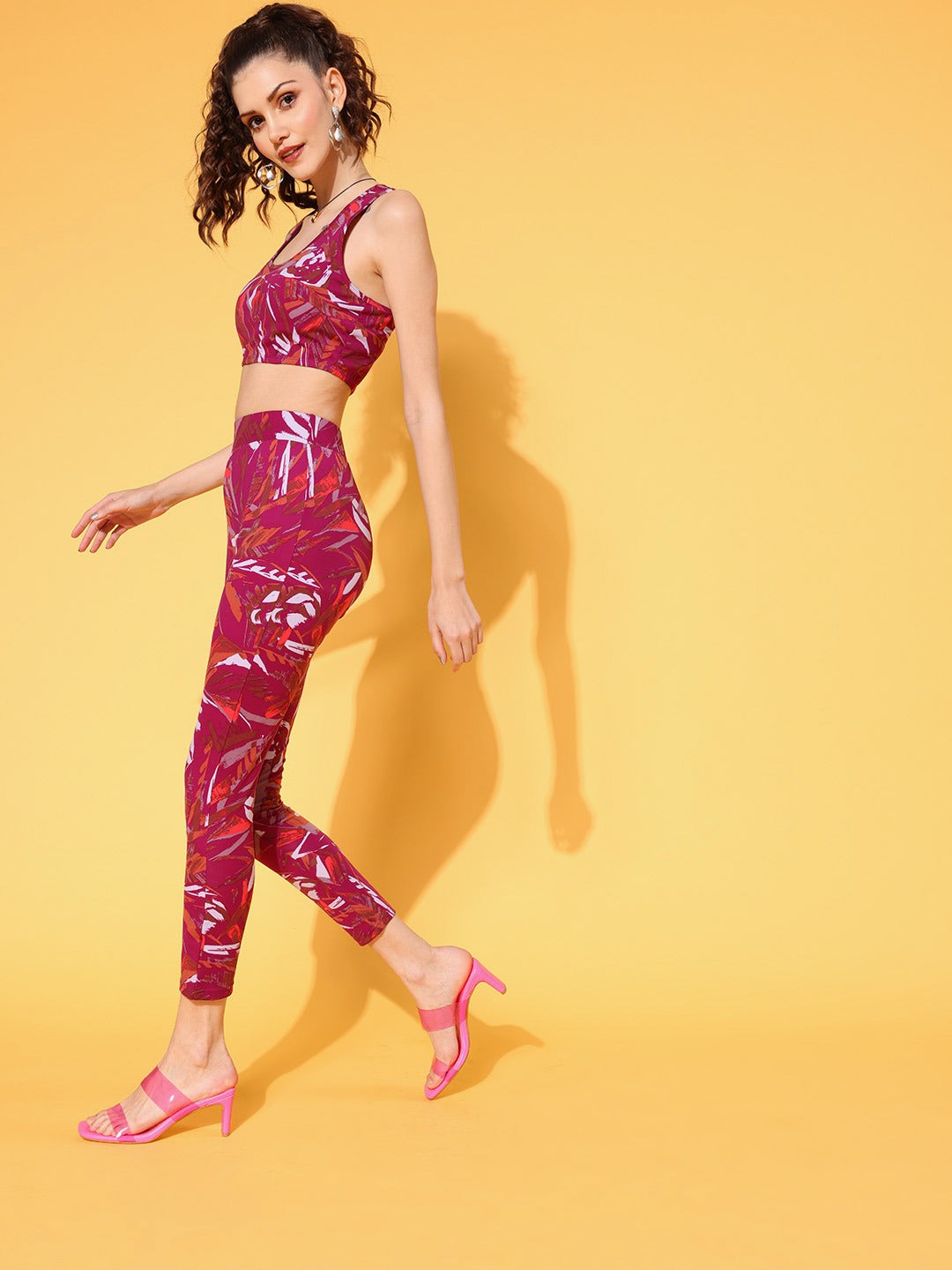Berrylush Women Pink Abstract Printed Round Neck Polyester Cropped Top & Tights Set