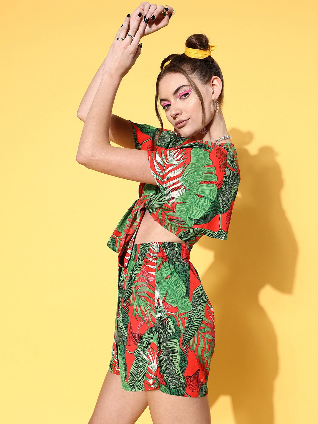 Get your closet ready for playful summertime with voguish and radiant style options like this Red & Green Tropical Printed V-Neck Front Tie-Up Crop Top & Mini Shorts Co-Ord Set introduced by Berrylush. Elegantly designed with crop length tops that give an eccentric appeal to your curves along with a tinge of trendy fashion essence. The above-knee length of the shorts makes your look appear sexy with an enticing exposure to your charming legs. Moreover, the slip-on closure makes the shorts easy to pull on and off with a sleek and nice finish. Complete your look fabulously by wearing this coordinate set with comfy sandals, silver earrings, rimless sunglasses, and a sassy handbag.