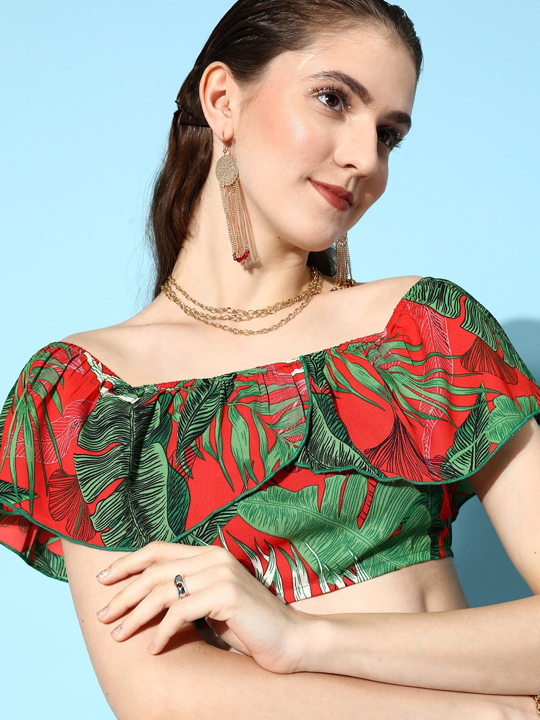 Berrylush Women Red & Green Tropical Printed Off-Shoulder Neck Wrap Hem Top & Shorts Set