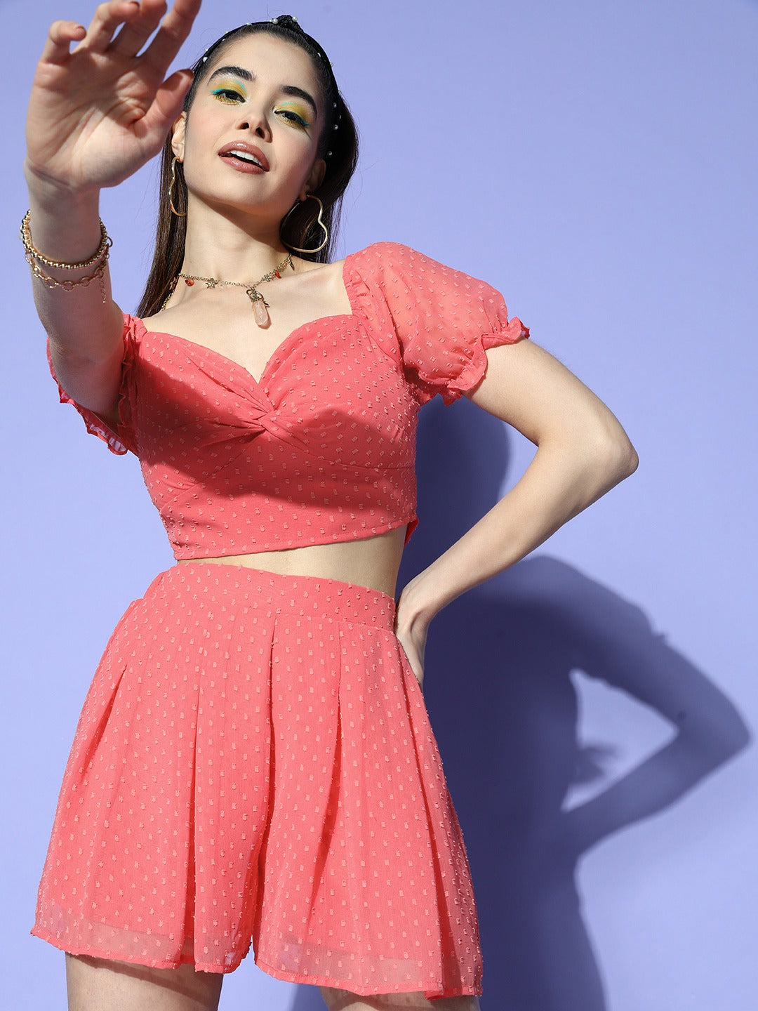 Berrylush Women Solid Pink Dobby Weave Sweetheart Neck Polyester Crop Top & Mini Shorts Co-Ord Set